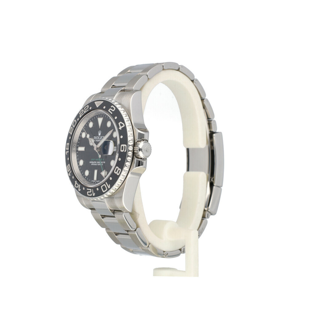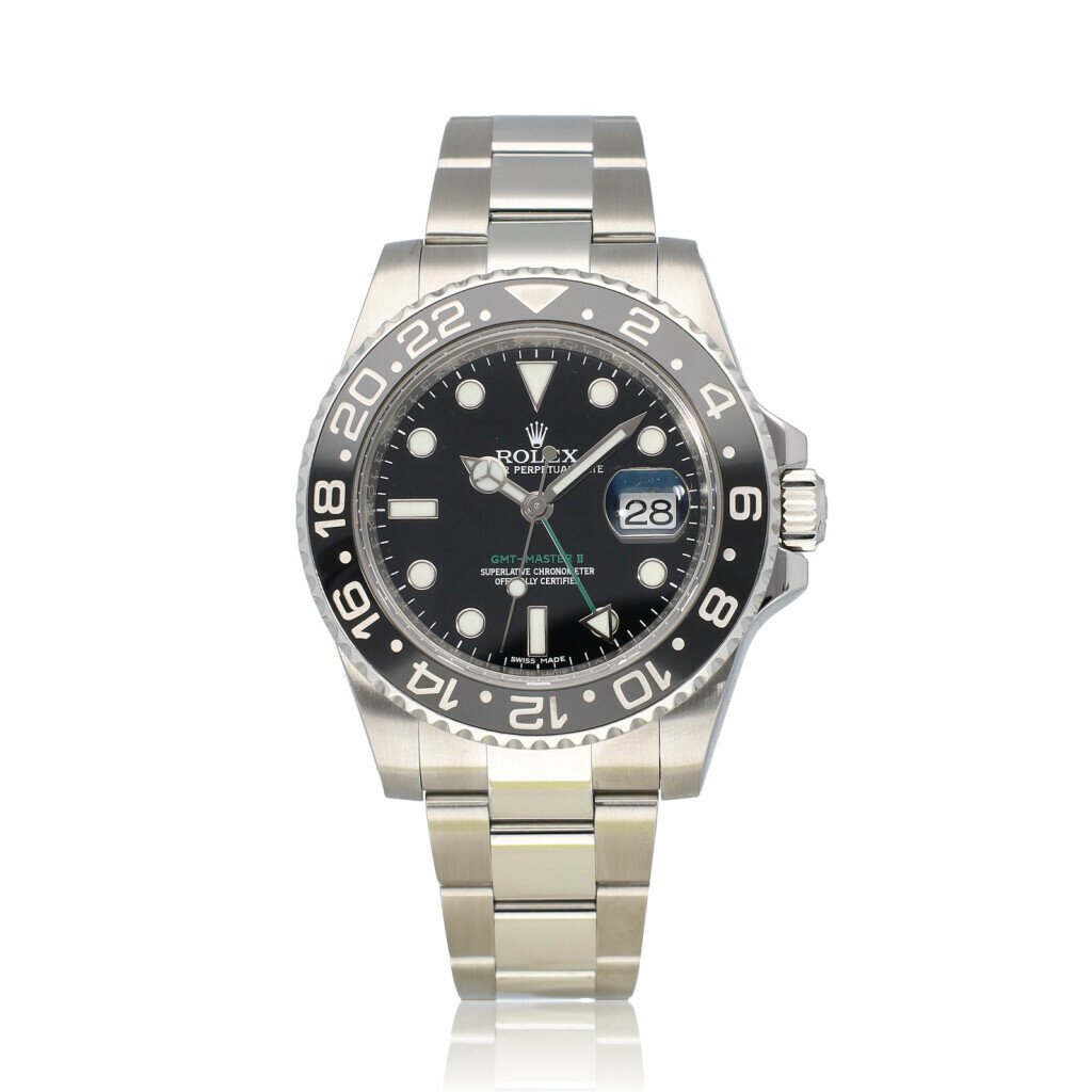 In very good condition Rolex GMT-Master II in steel with black dial, black ceramic bezel and steel Oyster bracelet from 2014 complete with box and papers.
