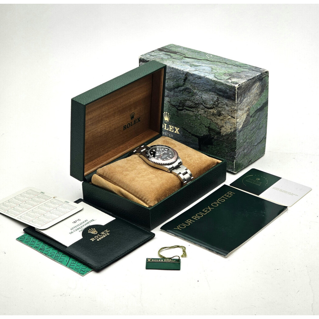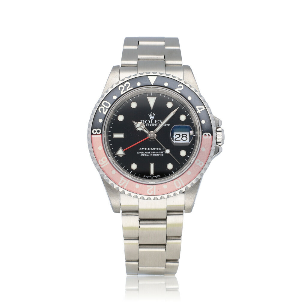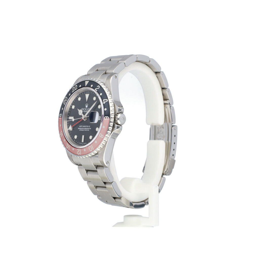 In very good condition Rolex GMT-Master II in steel with faded so called 'Coke' bezel, black dial and steel Oyster bracelet from 2001 complete with box and papers. Rolex serviced 3-2025 and not worn since. Rolex service certificate included.
