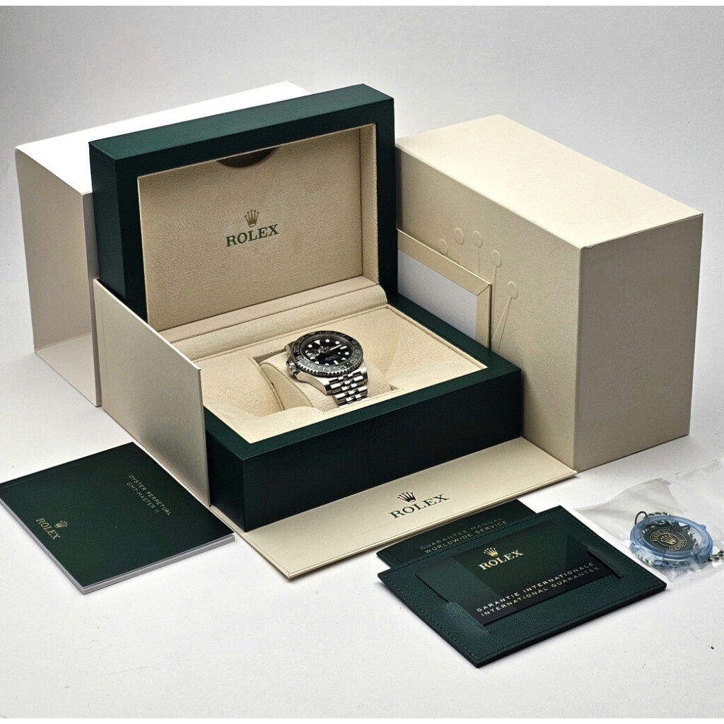 In very good condition Rolex GMT-Master II left handed so called 'Sprite' in steel with Jubilee bracelet from 2024 complete with box and papers