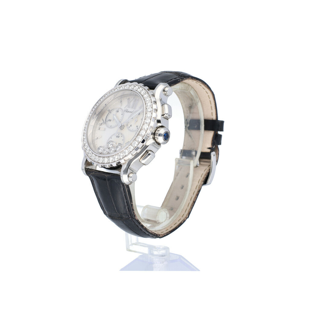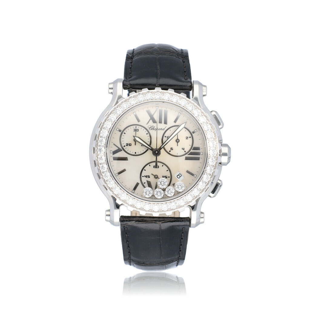 New Unworn Chopard Happy Sport Chronograph in steel with Mother of Pearl dial, 5 floating diamonds and white gold bezel with factory diamond complete with box + papers. Current listprice: € 33.400,-. NO VAT deductible.