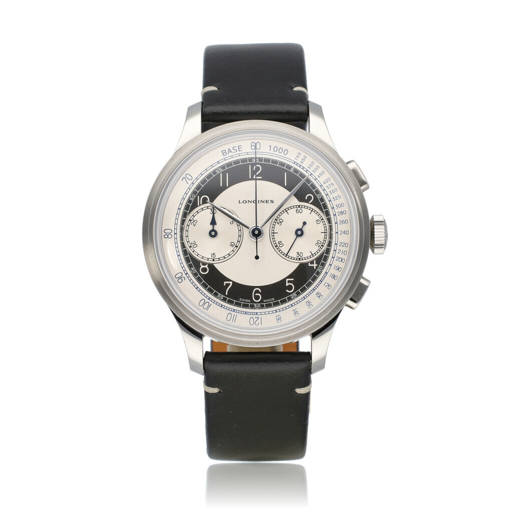 In very good condition Longines Heritage Classic Chronograph in steel with leather strap from 2025 complete with box and papers.