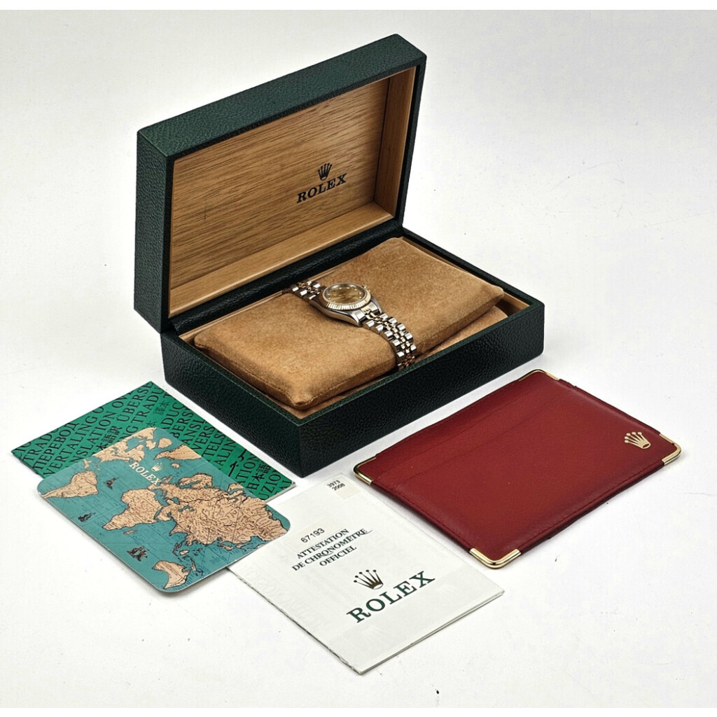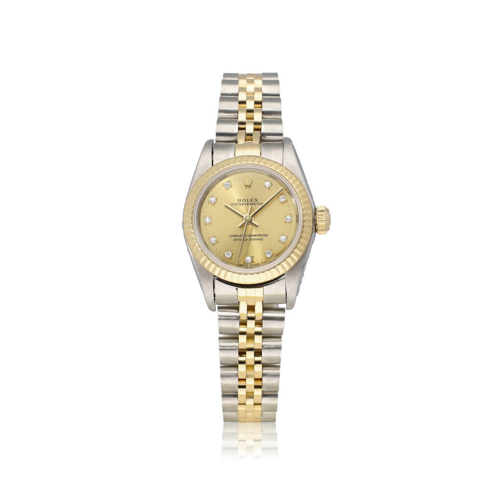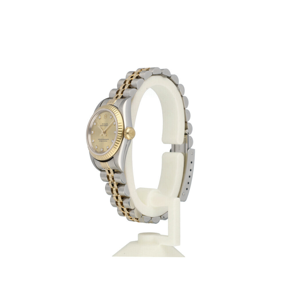 In very good conditiion Rolex Oyster Perpetual 26 mm in steel and yellow gold with champagne diamond dial and very tight Jubilee bracelet from 1998 complete with box and papers.