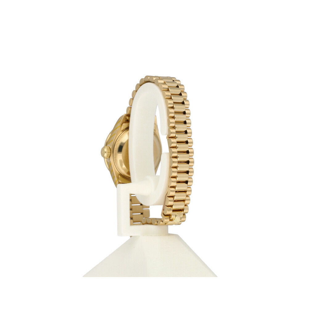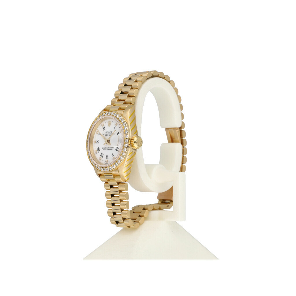 In very good condition Rolex Lady-Datejust in yellow gold with rare porcelain white roman factory diamond dial and bezel from +/- 1989 (L790... serial). No box and/or papers. Rolex serviced 10-2025 and not worn since. Rolex service certificate included.