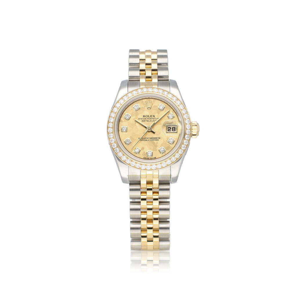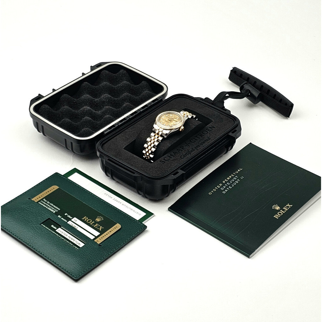 In very good condition Rolex Datejust 26 in steel and yellow gold with Jubilee bracelet, Gold Crystal dial and factory diamond bezel from 2014 complete with papers, no box.