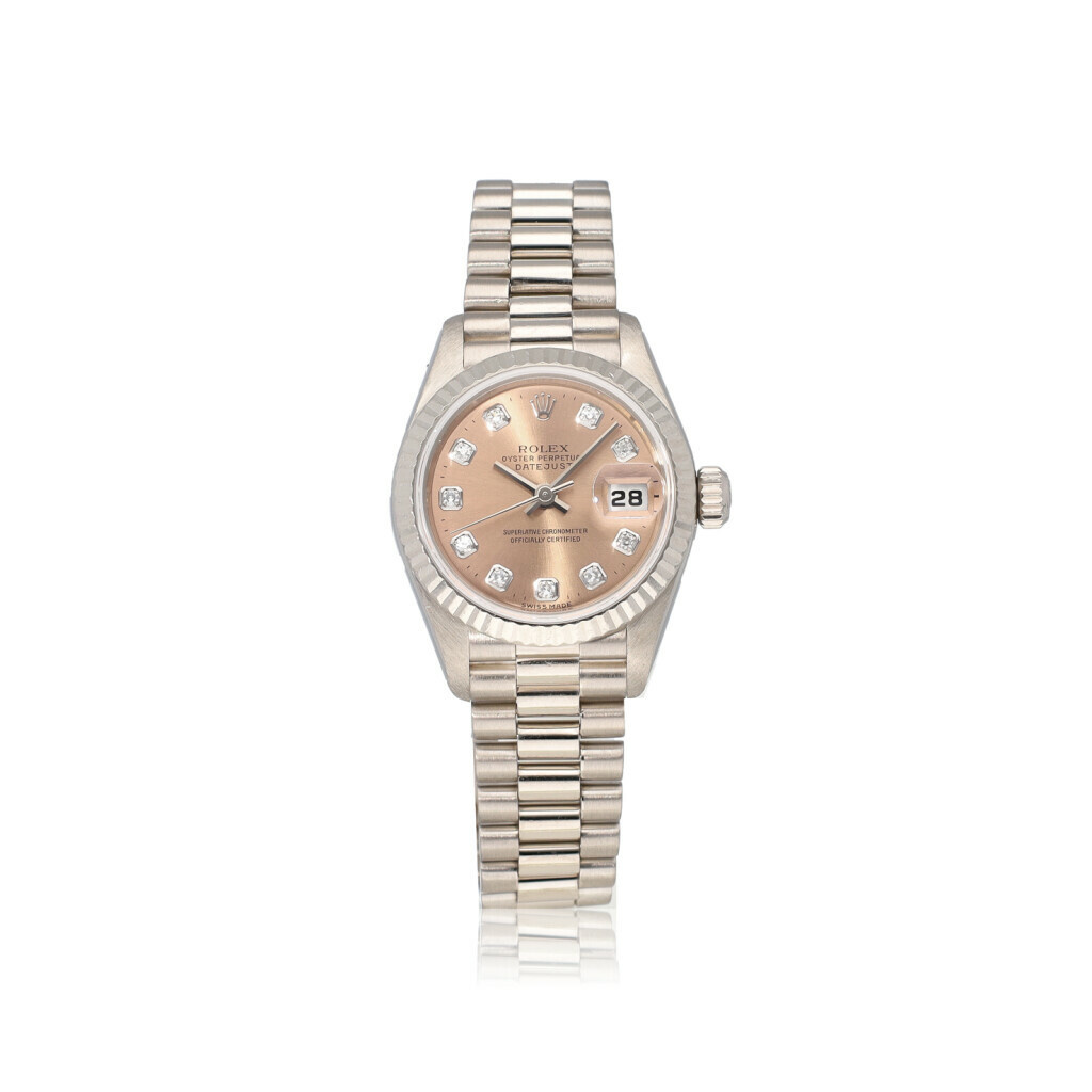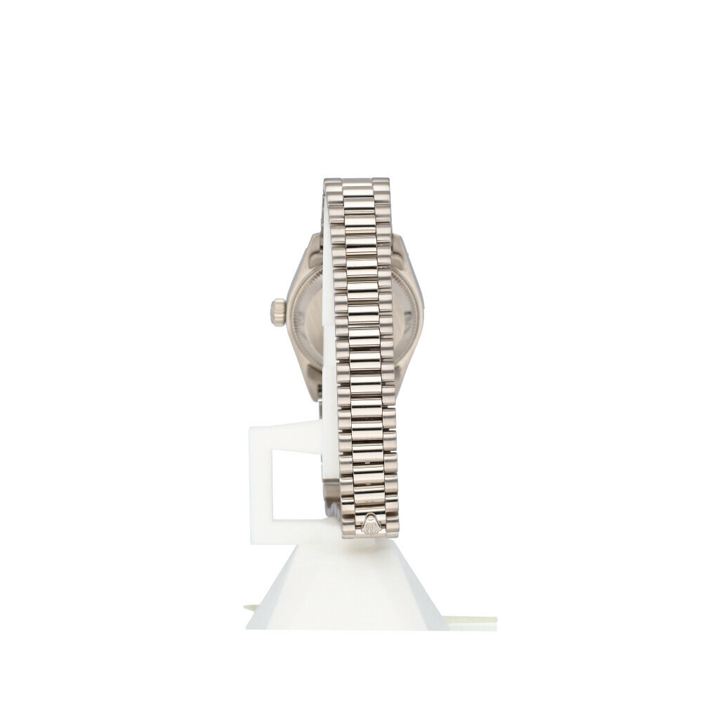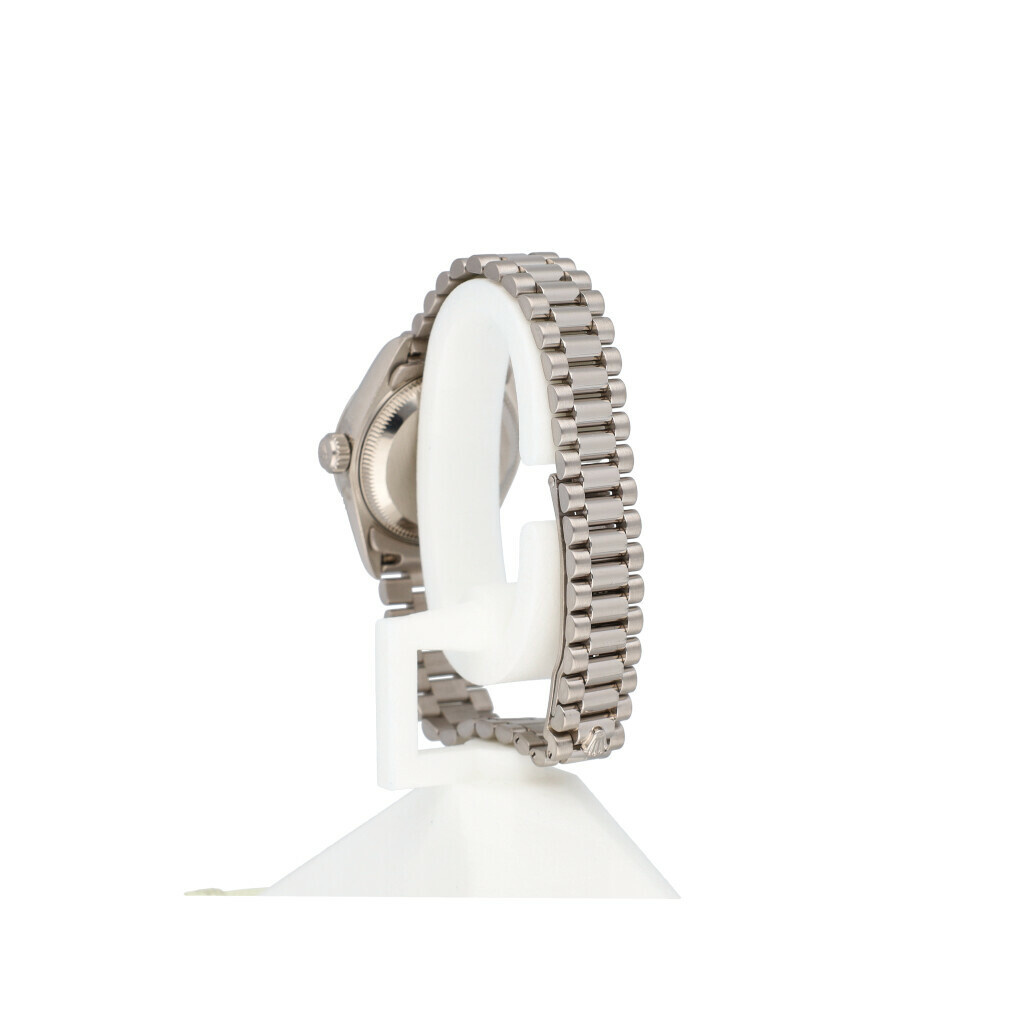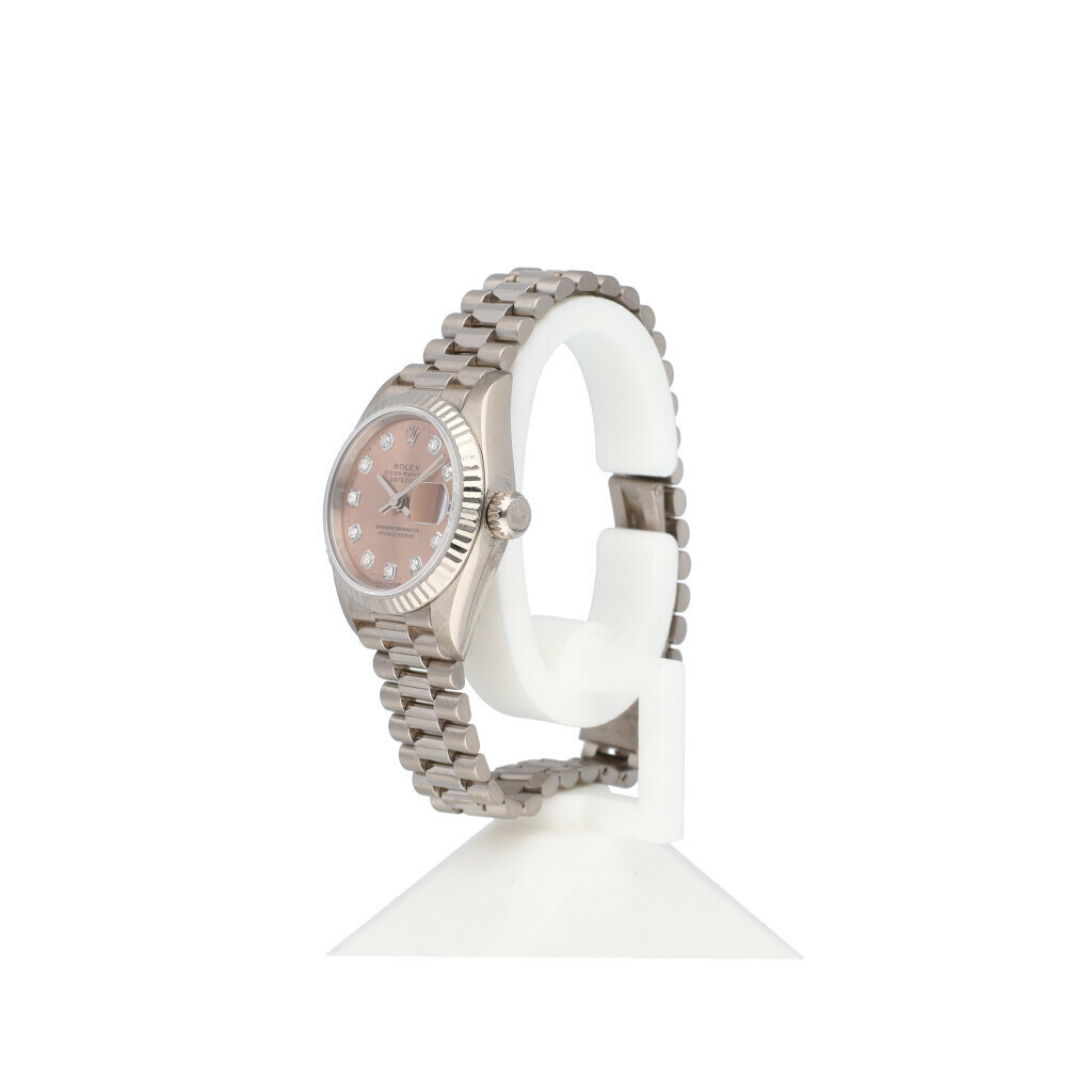 In very good condition Rolex Lady-Datejust 26 in white gold with pink diamond dial and President bracelet from 1999 complete with box and papers. Rolex serviced 12-2024 and not worn since. Rolex service certificate included.