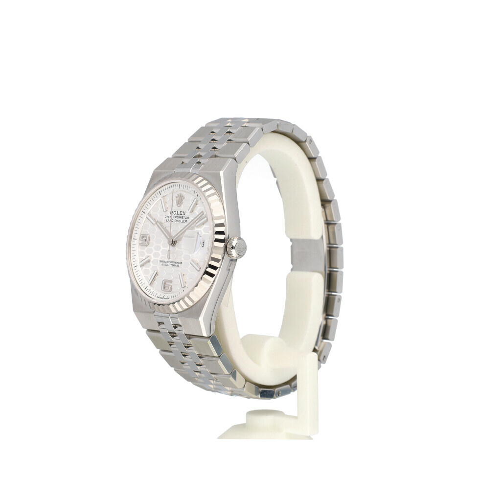 In very good condition Rolex Land-Dweller 36 in steel with white honeycomb dial, white gold fluted bezel and steel Jubilee bracelet from 2025 complete with box and papers.