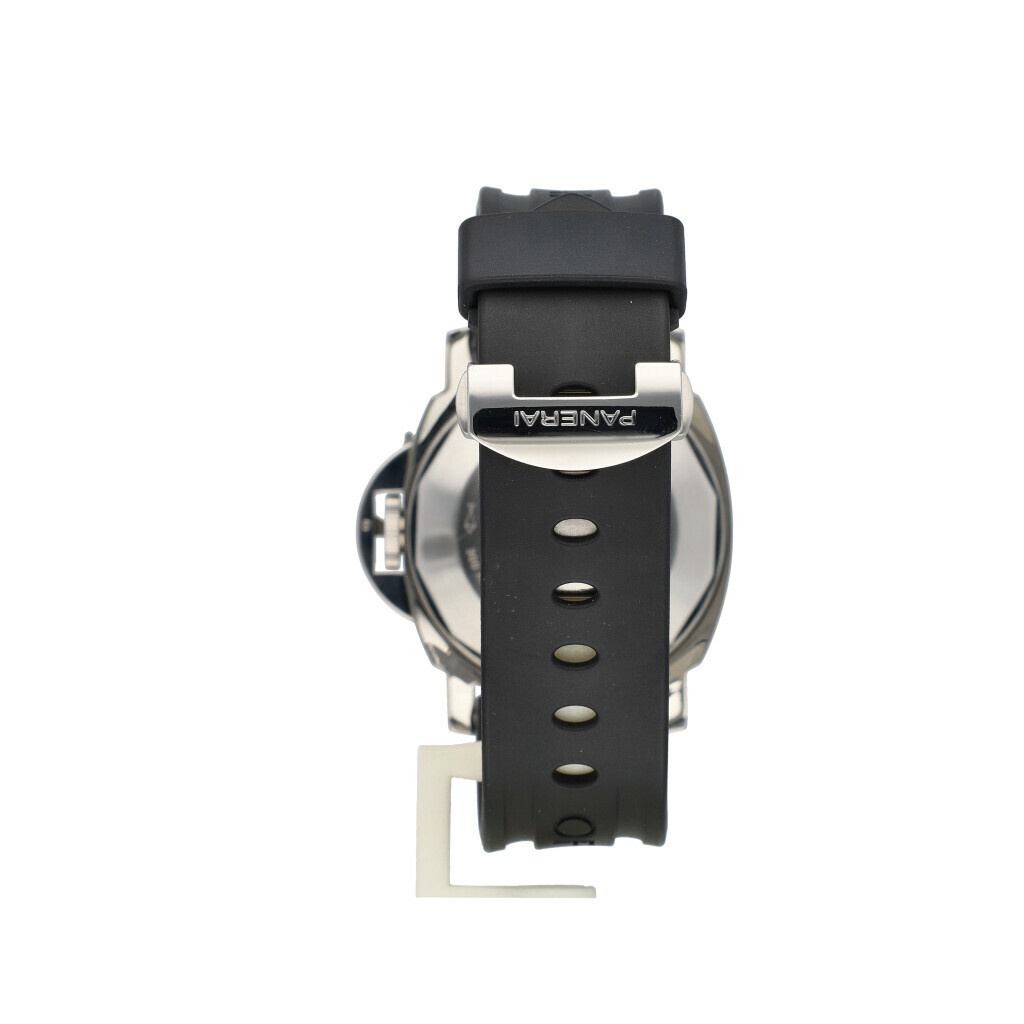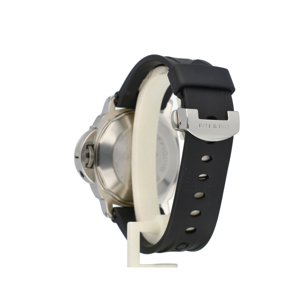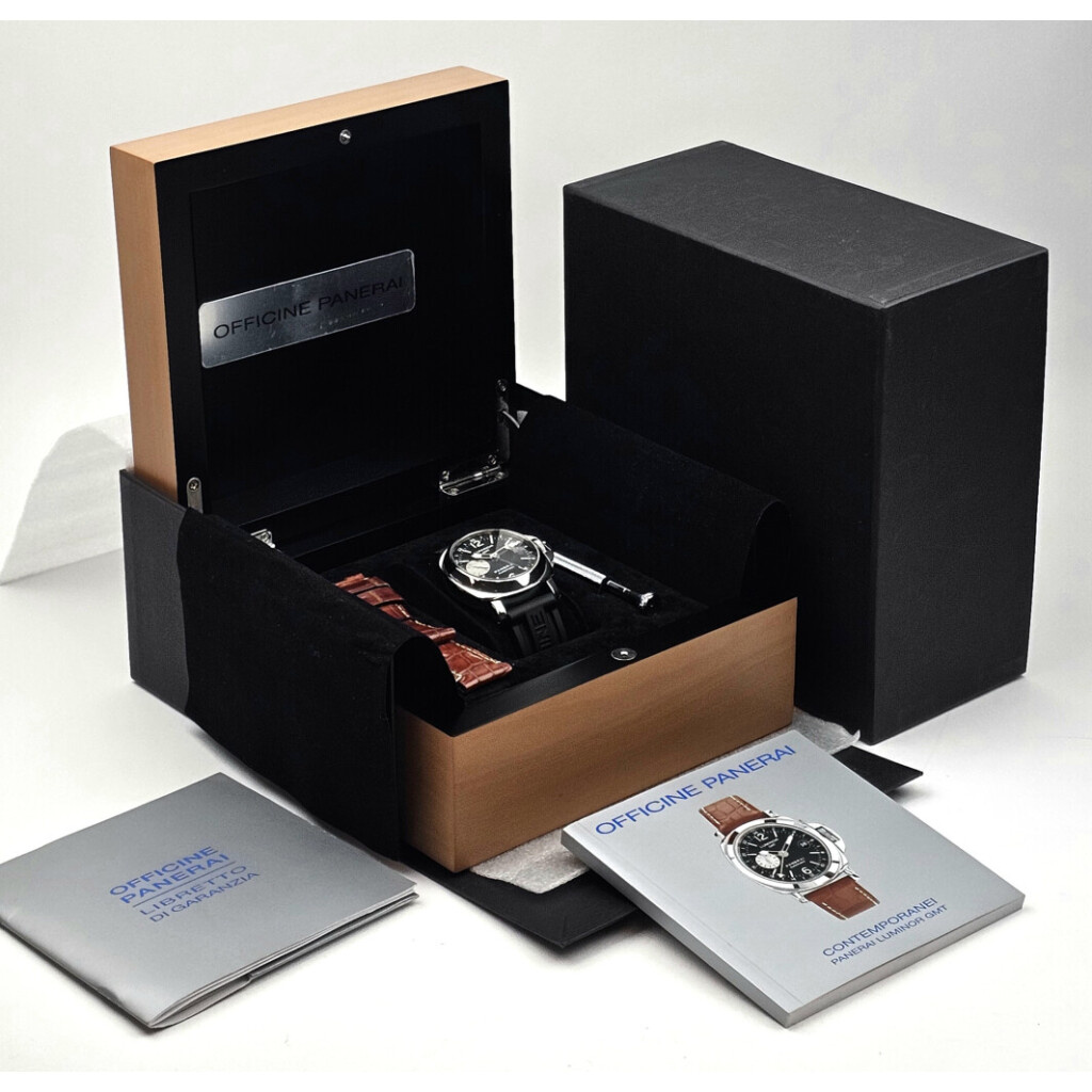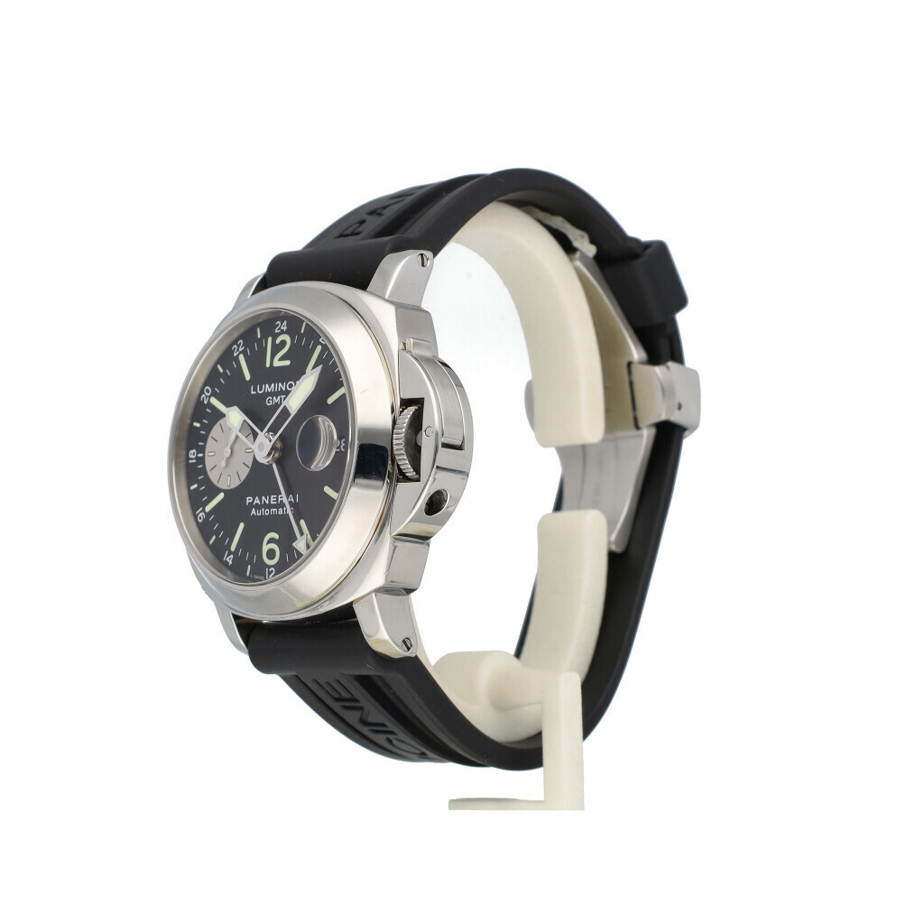 In very good condition Panerai Luminor GMT in steel with black dial and rubber strap from 2005 complete with box and papers.