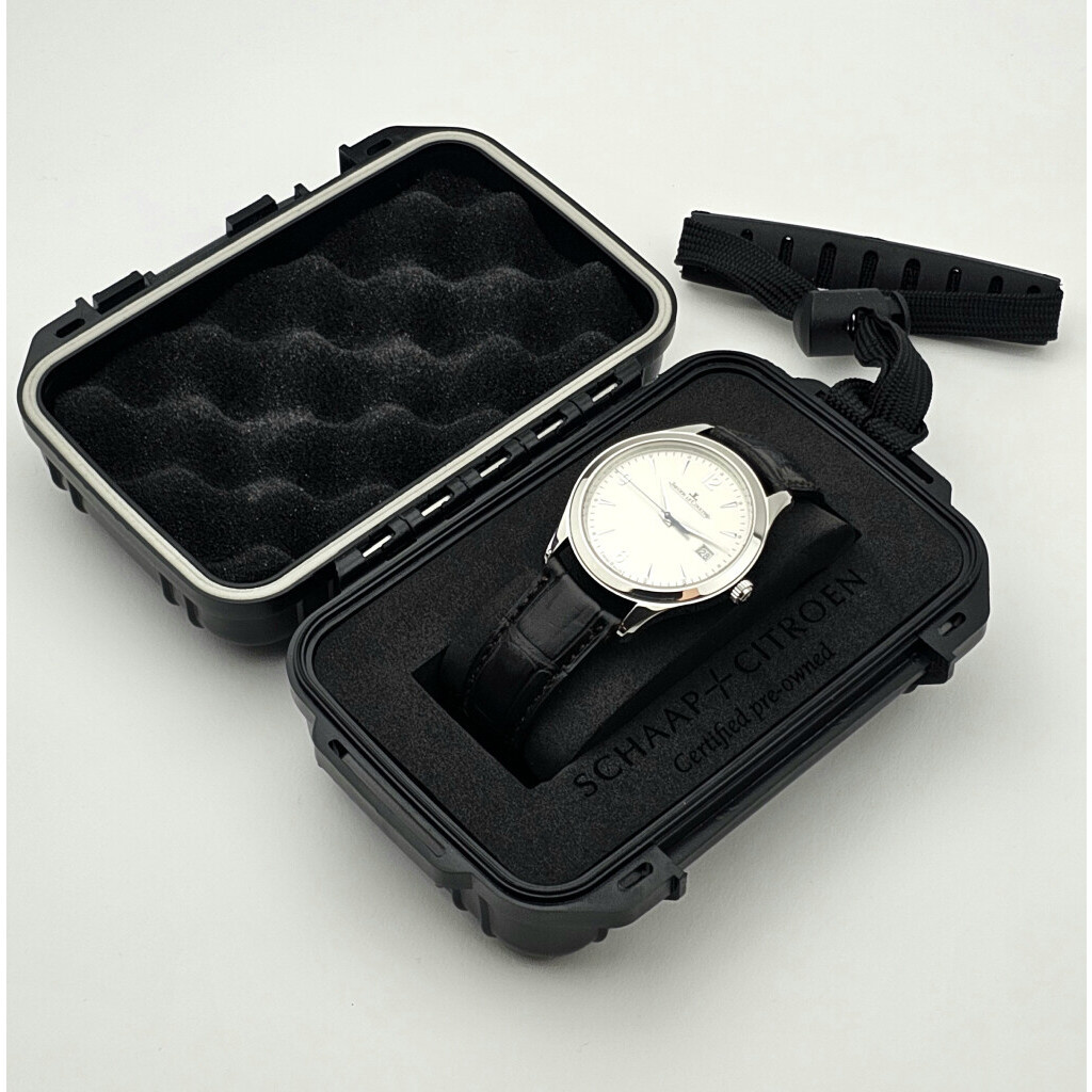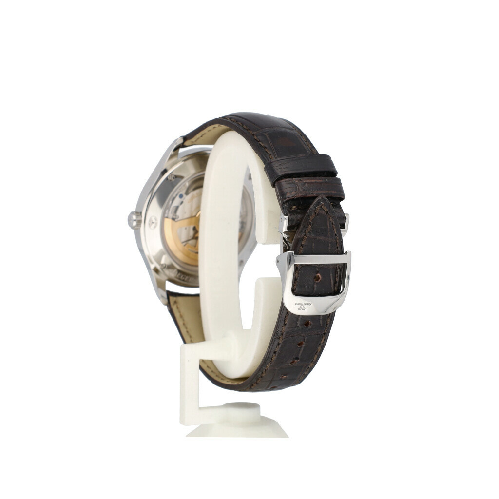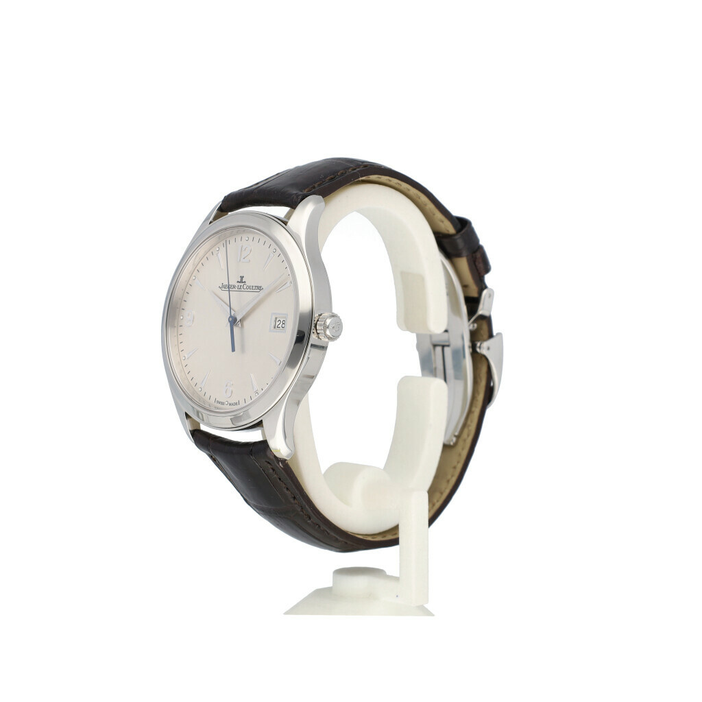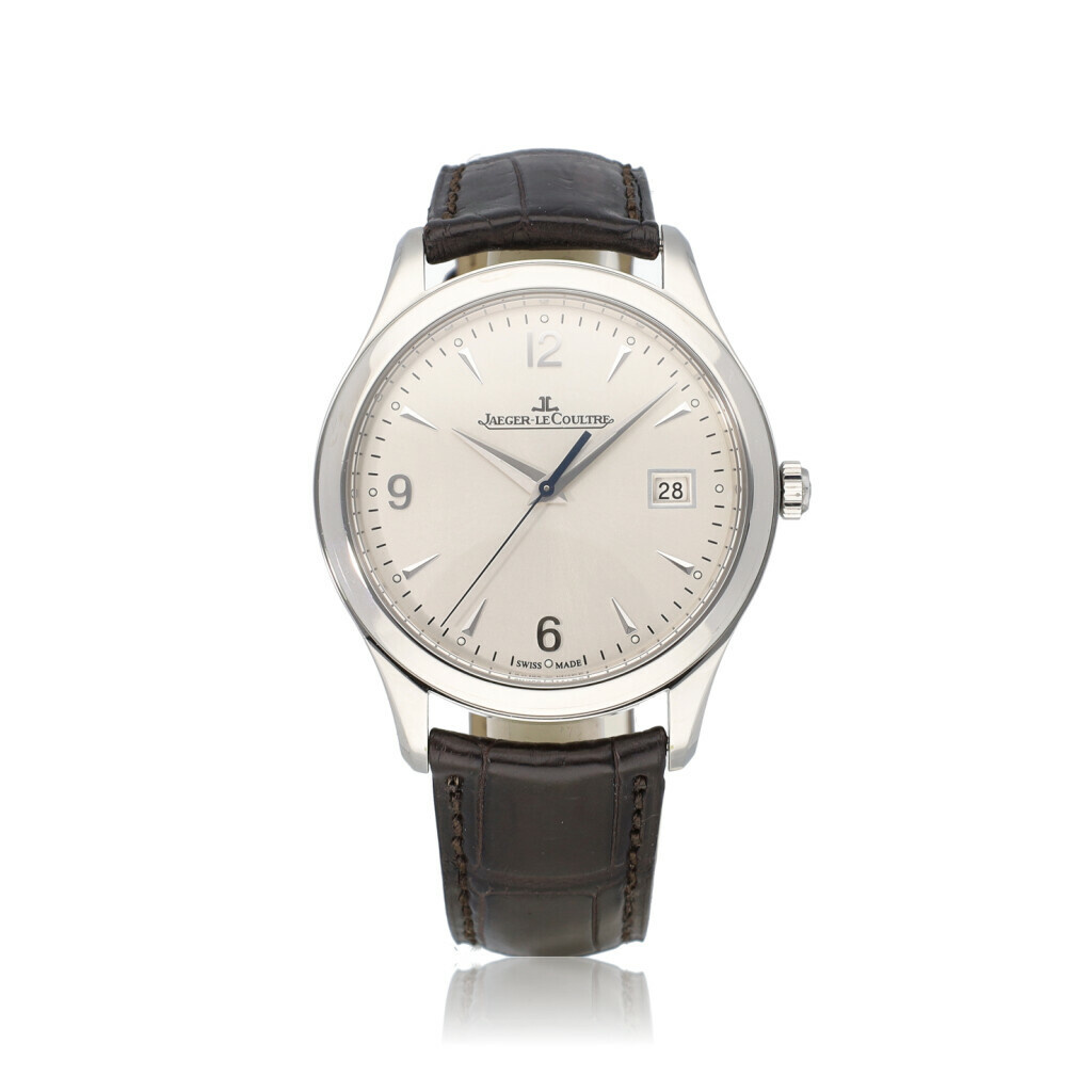 In very good condition Jaeger-LeCoultre Master Control Date with silver coloured dial, steel bezel and leather JLC strap. No box and/or papers.