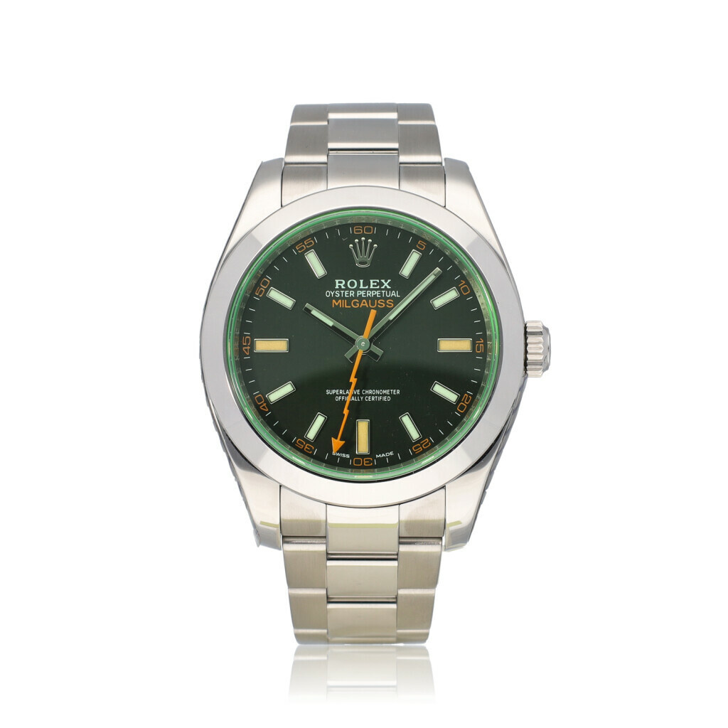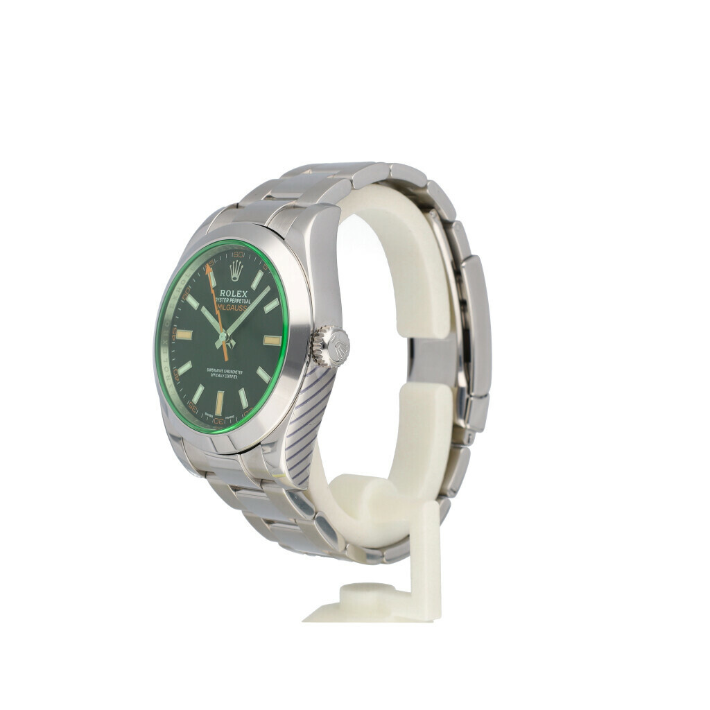In very good condition Rolex Milgauss in steel with black dial, green glass and steel Oyster bracelet from 2008 complete with box and papers. Rolex serviced 1-2026 and not worn since. Rolex service certificate included.