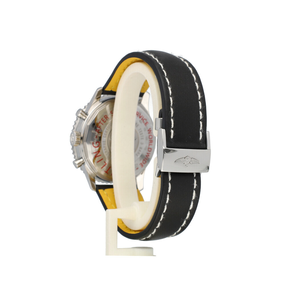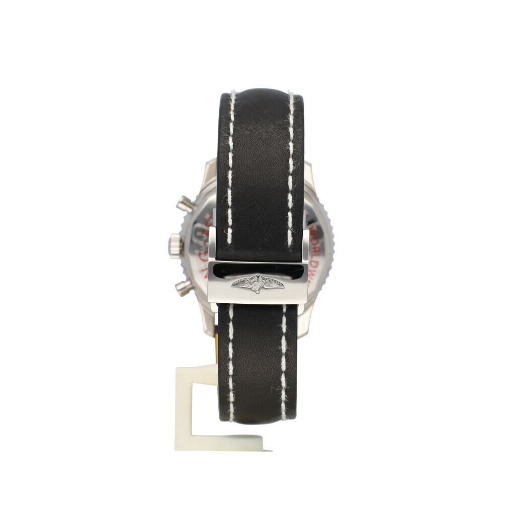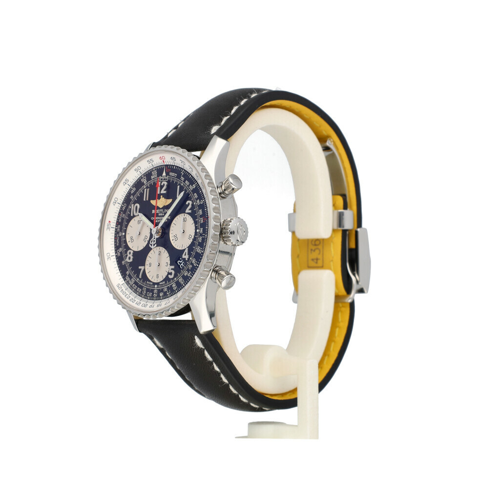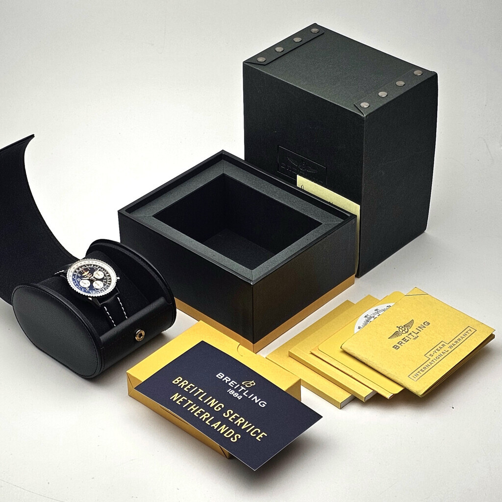 In very good condition Breitling Navitimer Chronograph in steel with black dial and brand new leather Breitling strap from 2013 complete with box and papers. Breitling serviced 10-2025 including Breitling strap and not worn since. Breitling service certificate included.