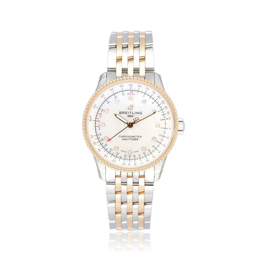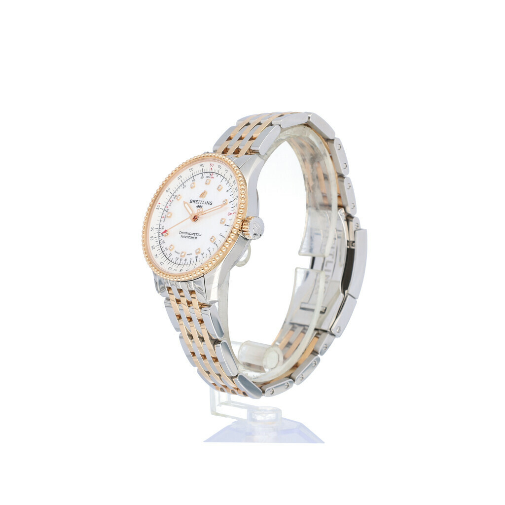 In fair condition Breitling Navitimer Automatic in steel and rose gold with MOP dial complete with box and papers. 21% VAT deductible when shipped outside of the European Union.