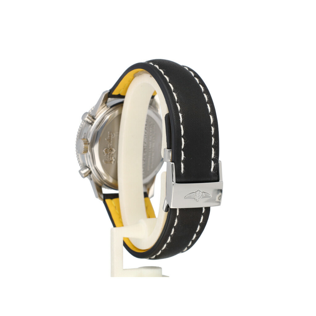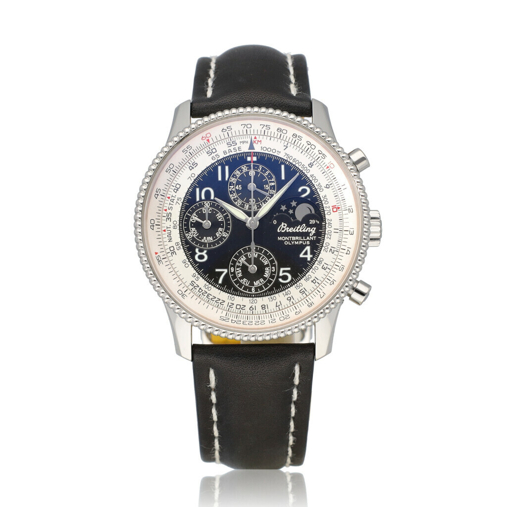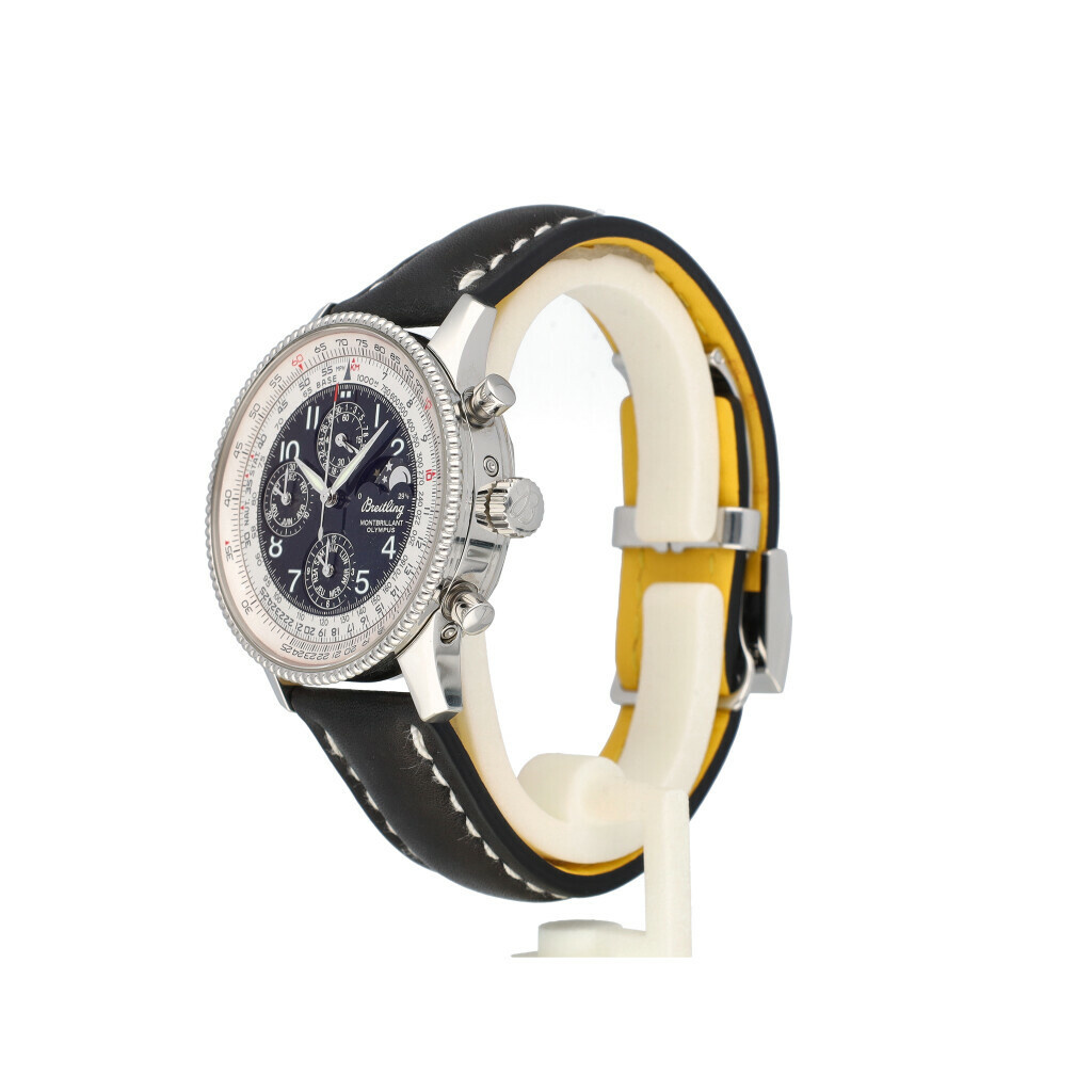 In very good condition Breitling Navitimer Montbrillant Olympus in steel with black dial and brand new Breitling leather strap. No box and/or papers.