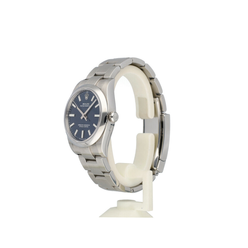 In very good condition Rolex Oyster Perpetual 34 in steel with blue dial, steel domed bezel and steel Oyster bracelet from 2022 complete with papers, no box.