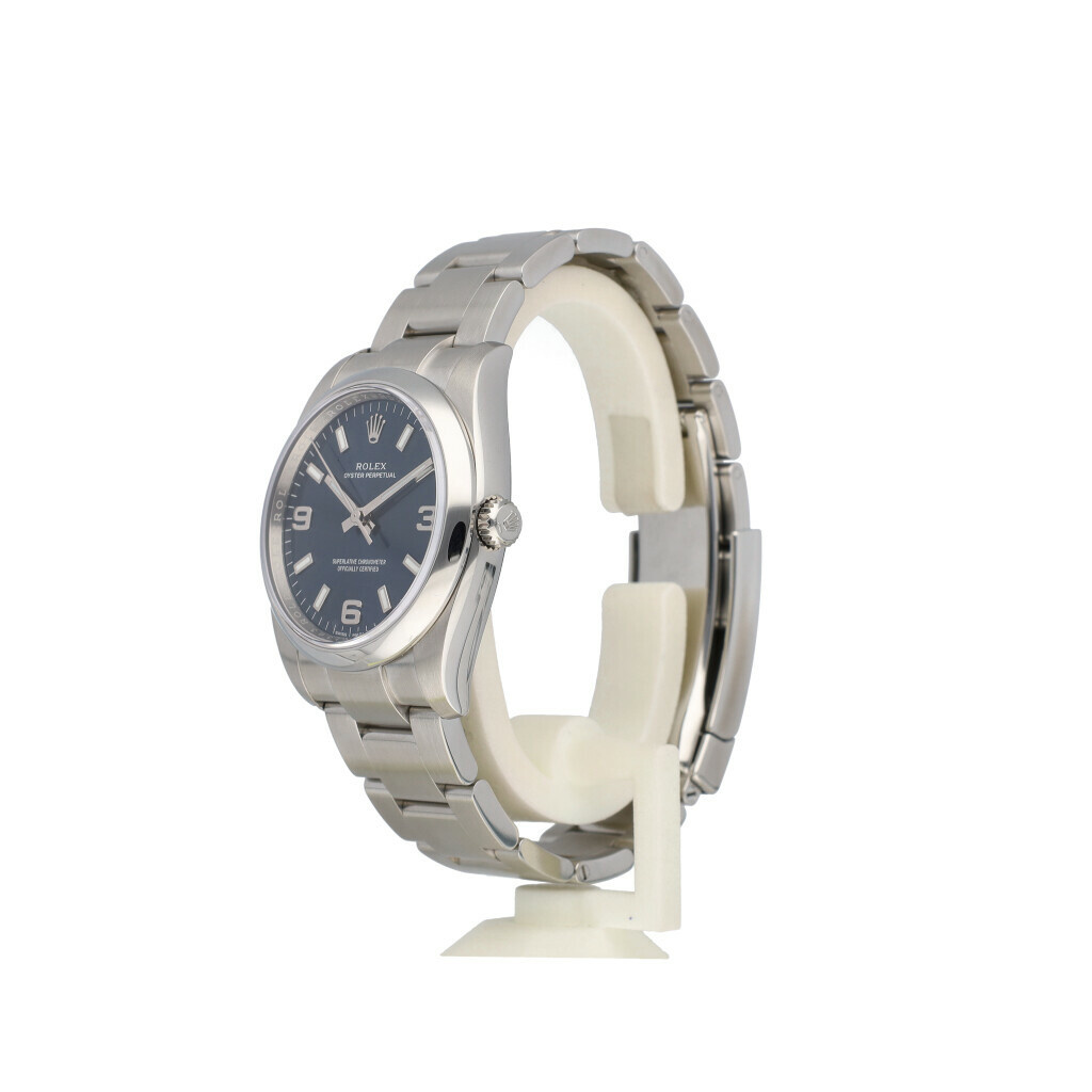 In very good condition Rolex Oyster Perpetual 34 in steel with blue dial complete with box, no papers. Radom serial number so from after 2011 till now.