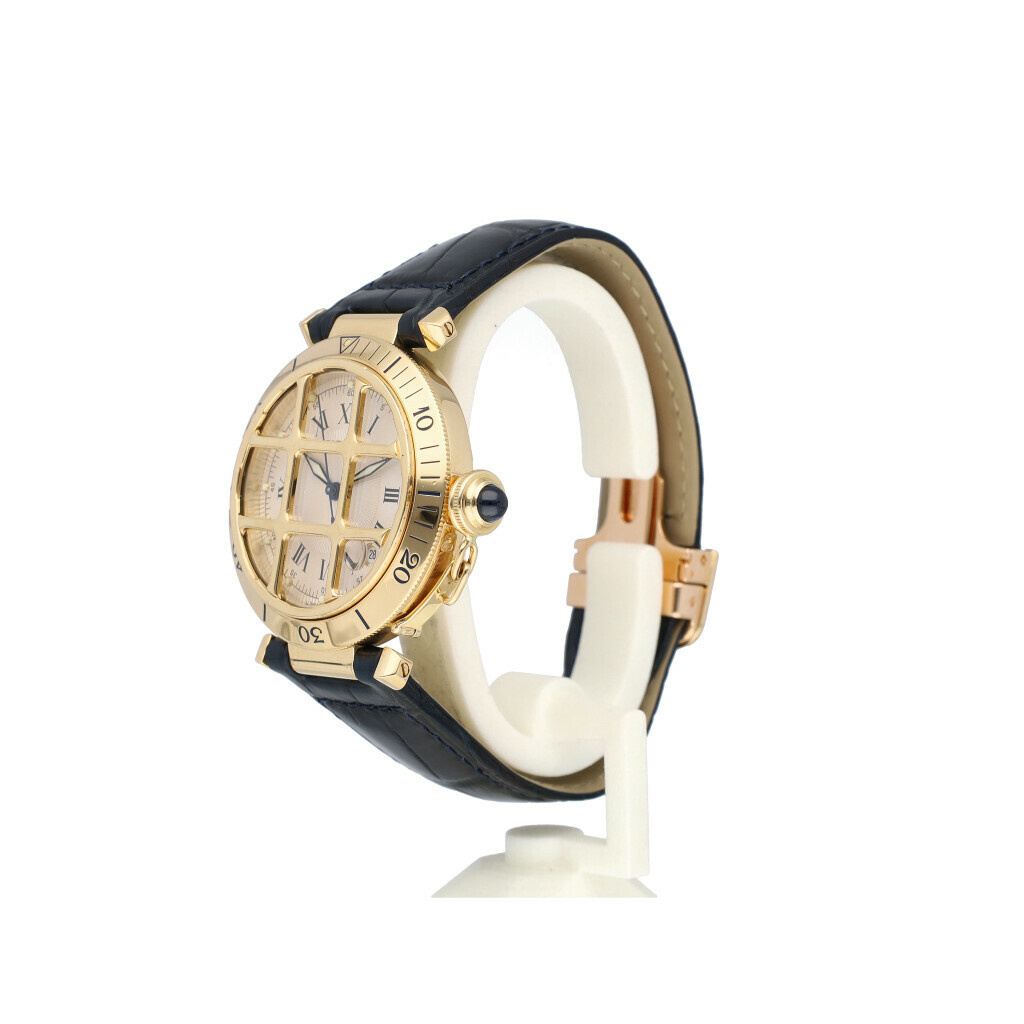 In very good condition Cartier Pasha de Cartier in yellow gold with rare dial grill - silver roman dial and brand new leather Cartier strap from 1997 complete with box and papers.