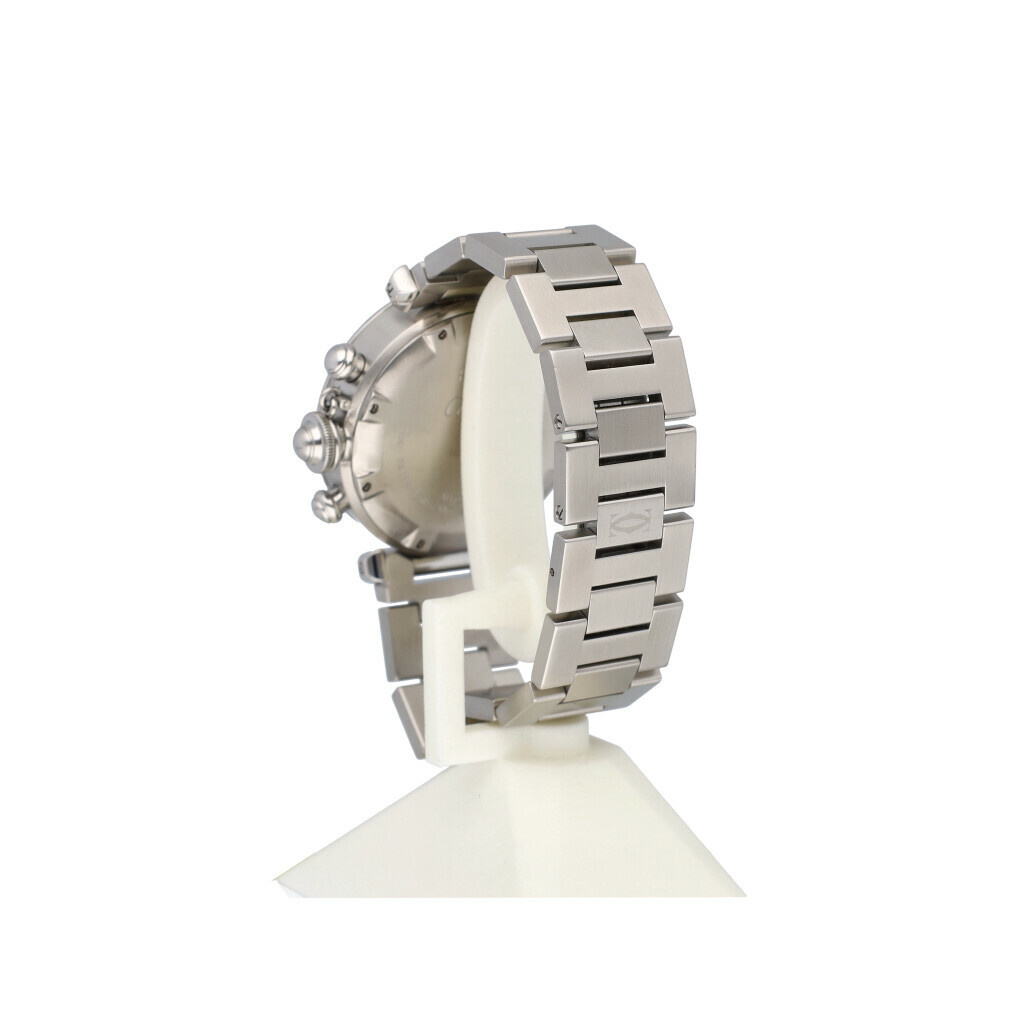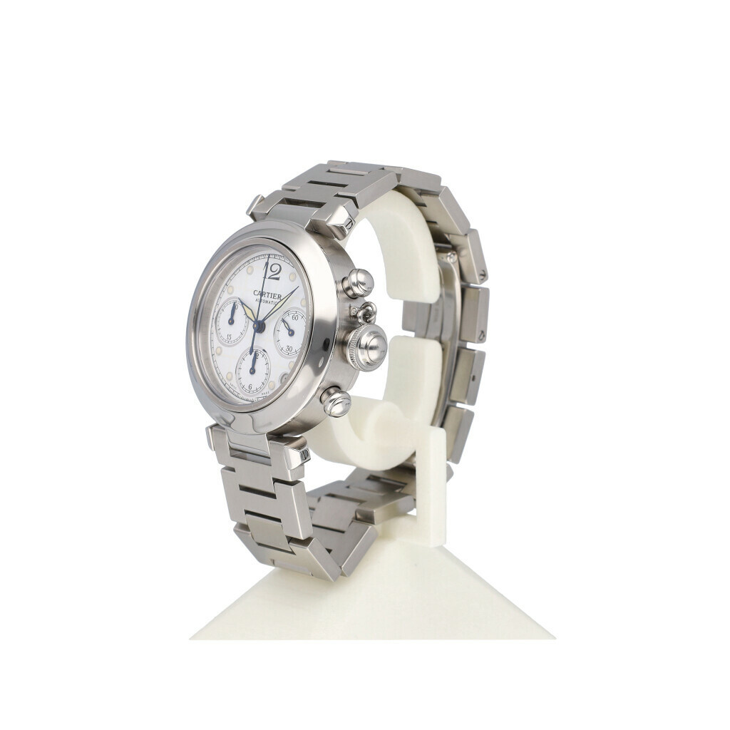 In very good condition Cartier Pasha Chronograph in steel with white dial and steel bracelet. No box and/or papers.