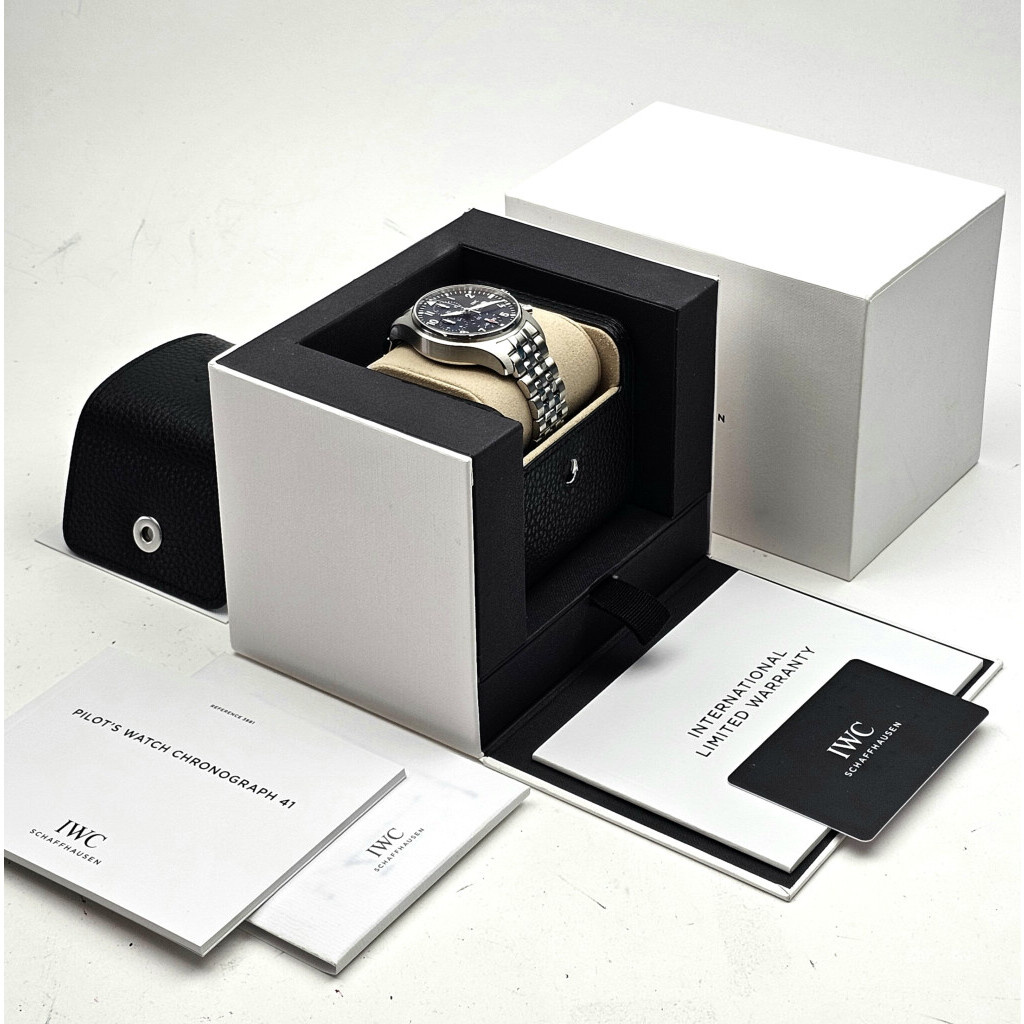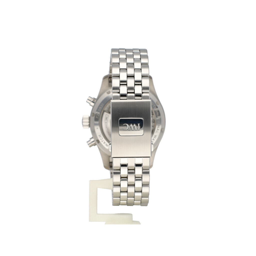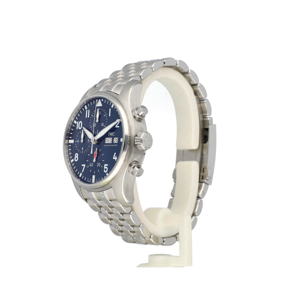 In very good condition IWC Pilot Chronograp day date in steel with blue dial and steel bracelet from 2021 complete with box and papers.