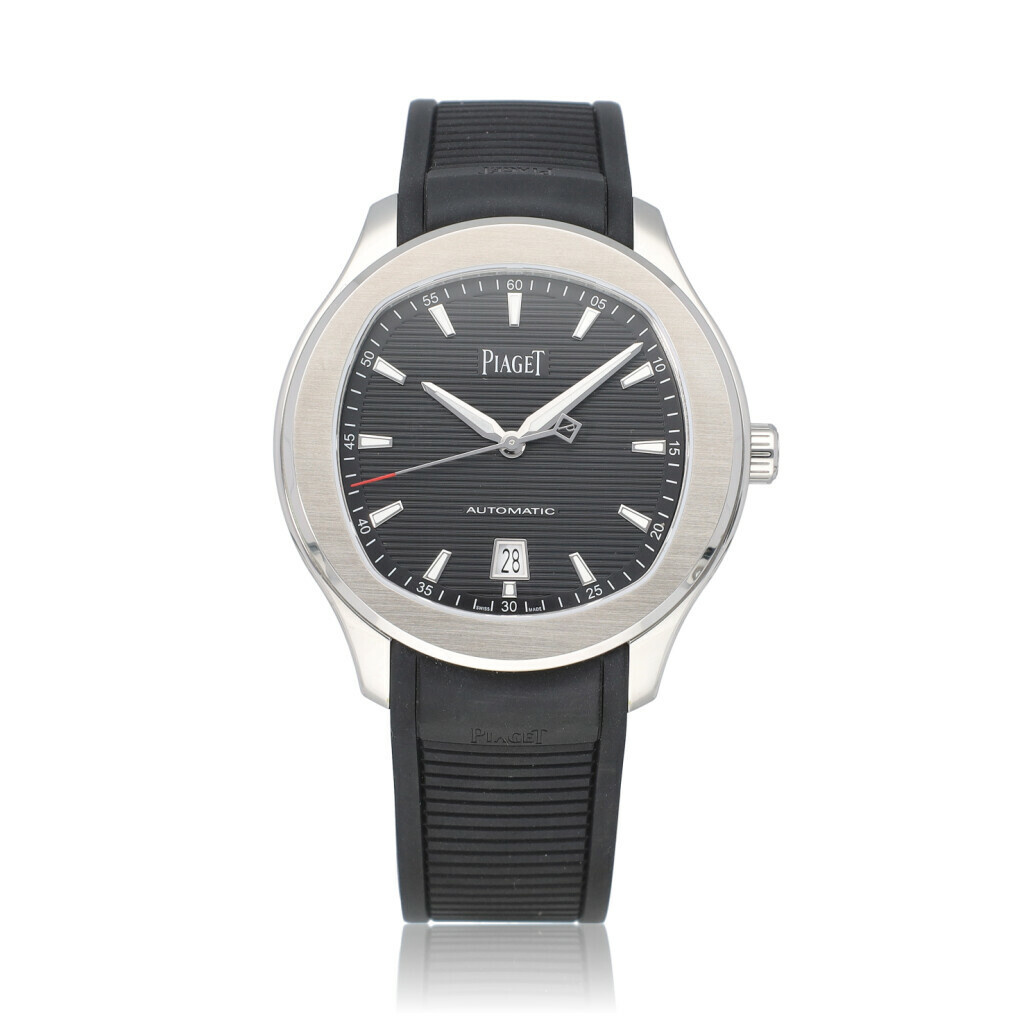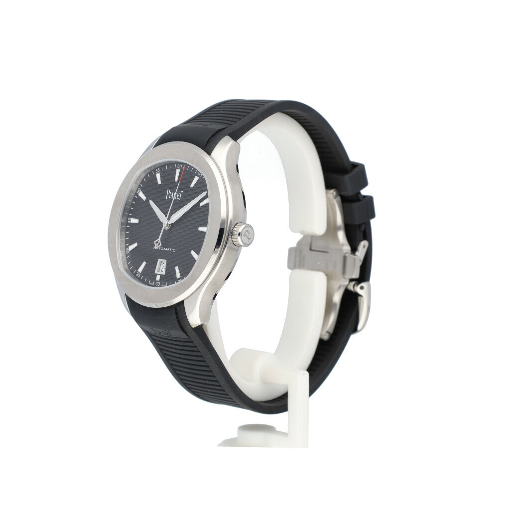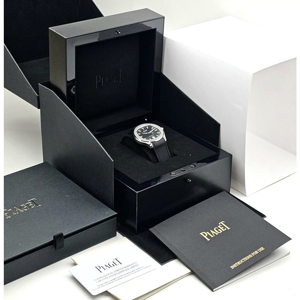 In very good condition Piaget Polo Date in steel with black dial and rubber bracelet from 2023 complete with box and papers.