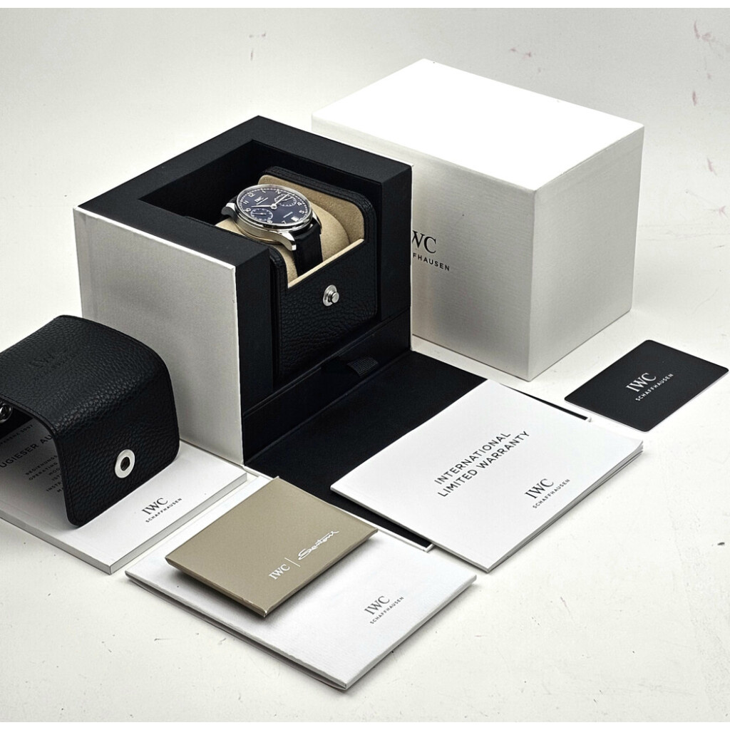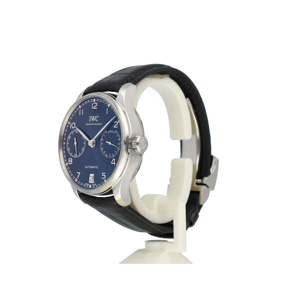 In very good condition IWC Portugieser Automatic 7-days in steel with blue dial from 2022 complete with box and papers. IWC serviced 2-2026 including new IWC strap and not worn since. IWC service certificate included.