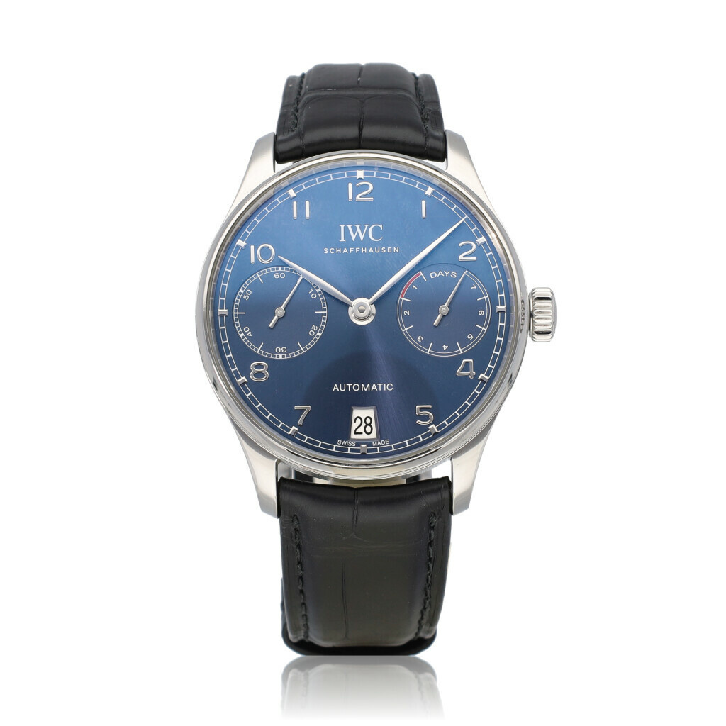 In very good condition IWC Portugieser Automatic 7-days in steel with blue dial from 2020 complete with box and papers. Comes with new IWC strap, not worn since.