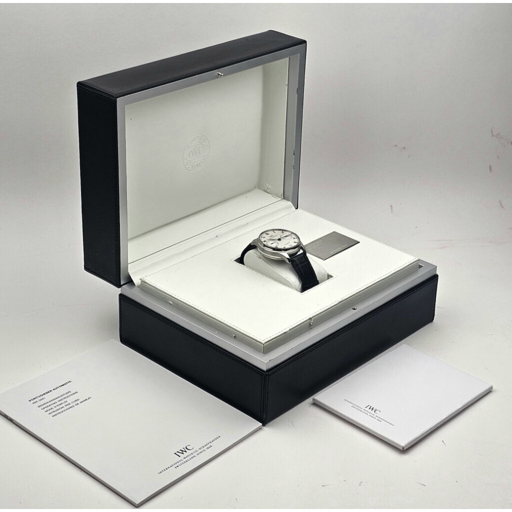 In very good condition IWC Portugieser Automatic 7-days in steel with silver dial and black alligator strap complete with box, no papers.