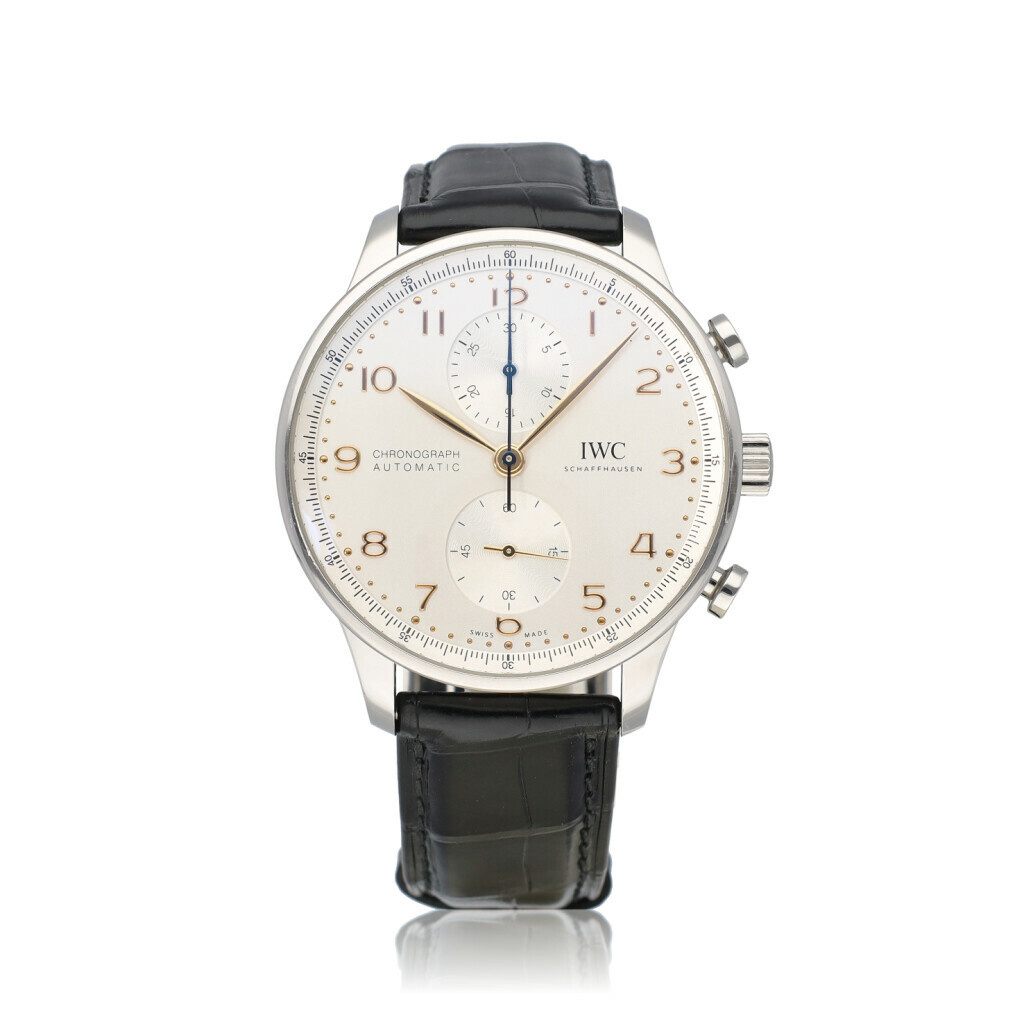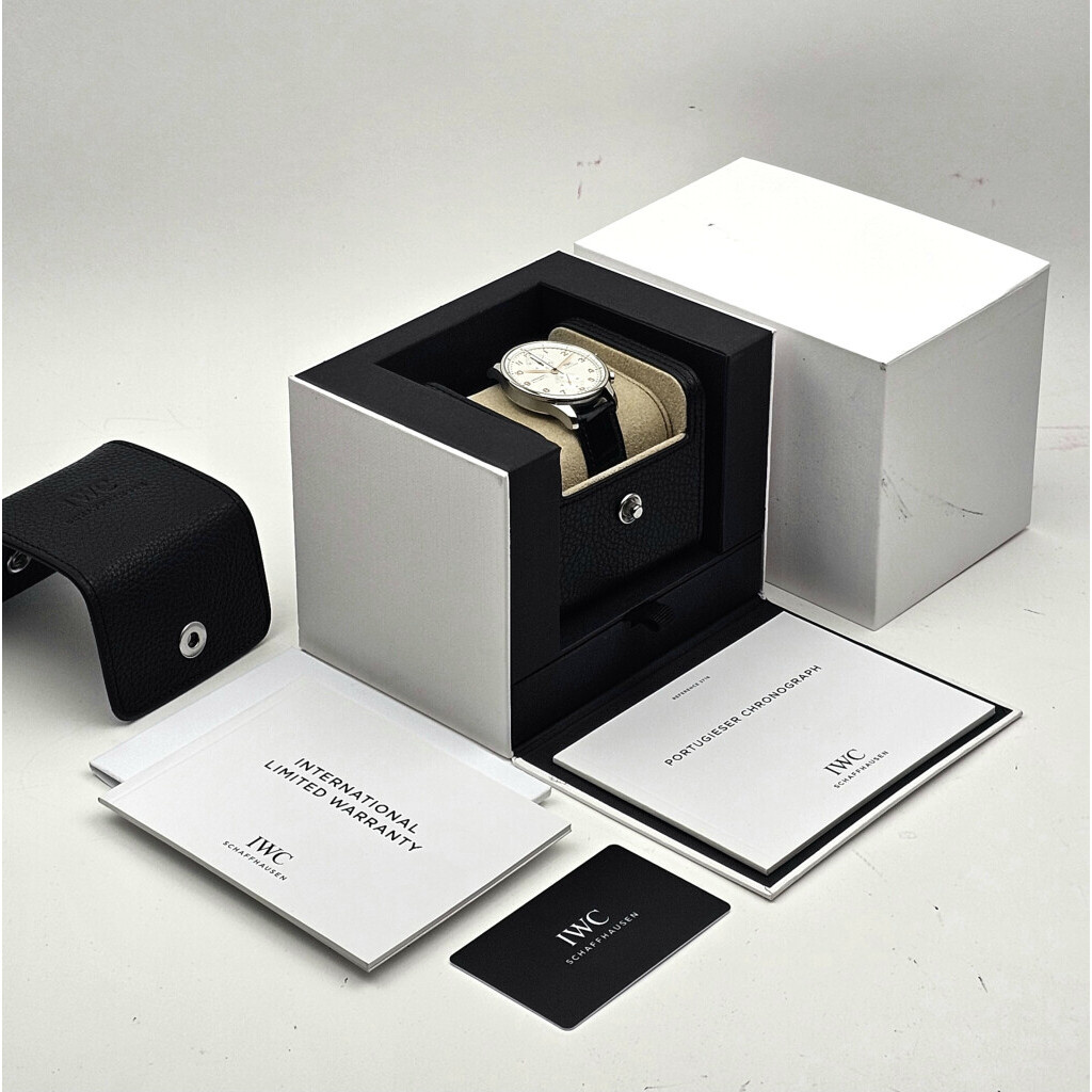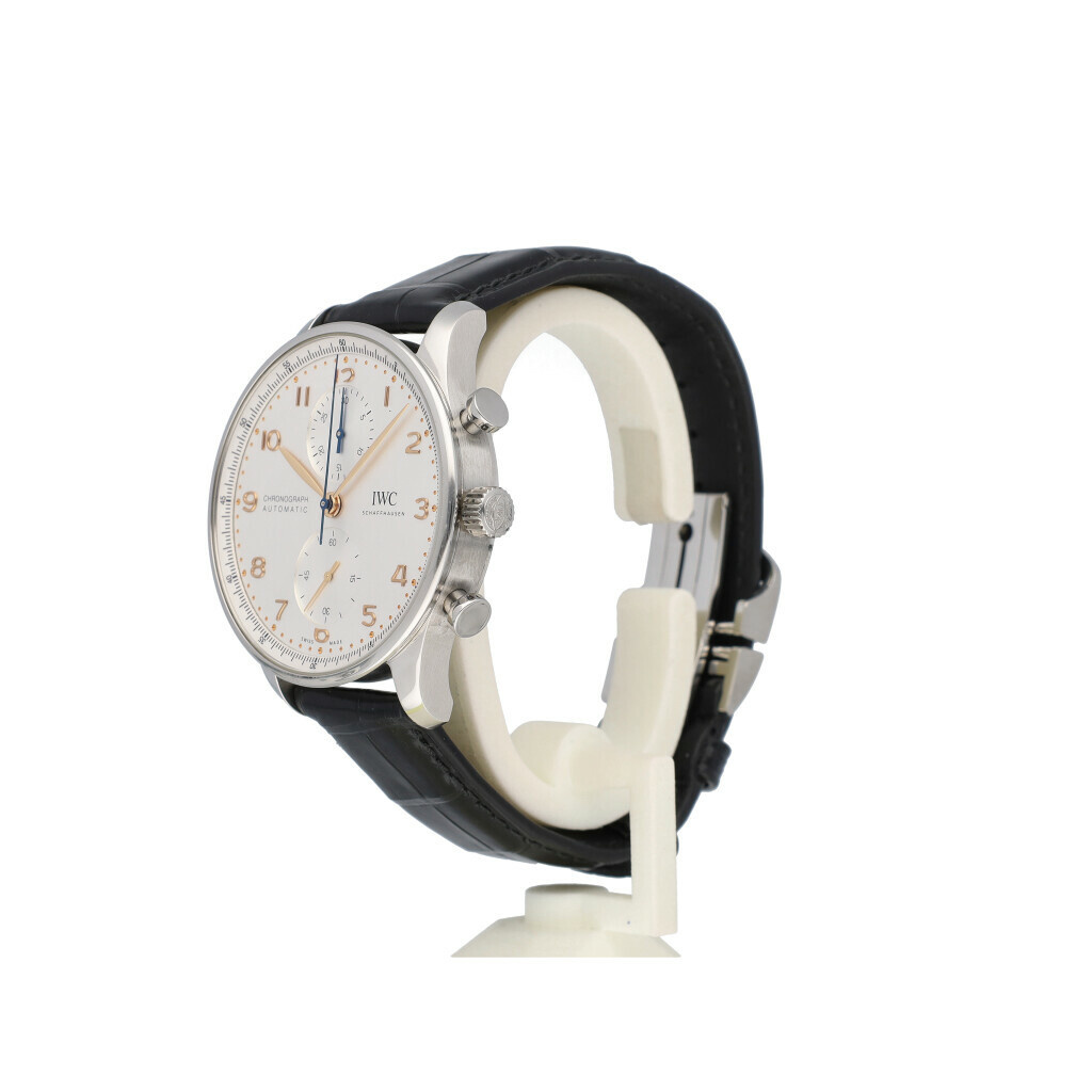 In very good condition IWC Portugieser Chronograph Automatic in steel with silver dial and black alligator leather strap from 2023 complete with box and papers. 21% VAT deductible when shipped outside of the European Union.