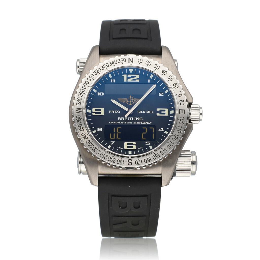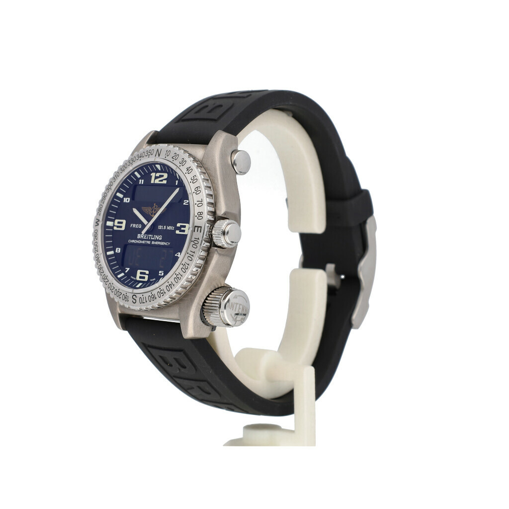 In very good condition Breitling Emergency in titanium with black dial, titanium bezel and titanium bracelet from 2006 complete with box and papers. Breitling serviced 2-2026 and not worn since. Breitling service certificate included.