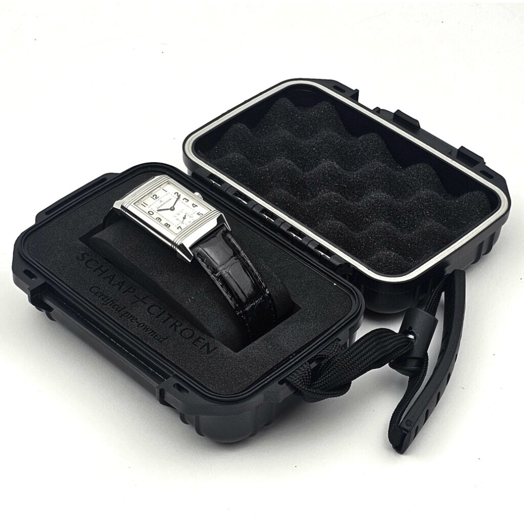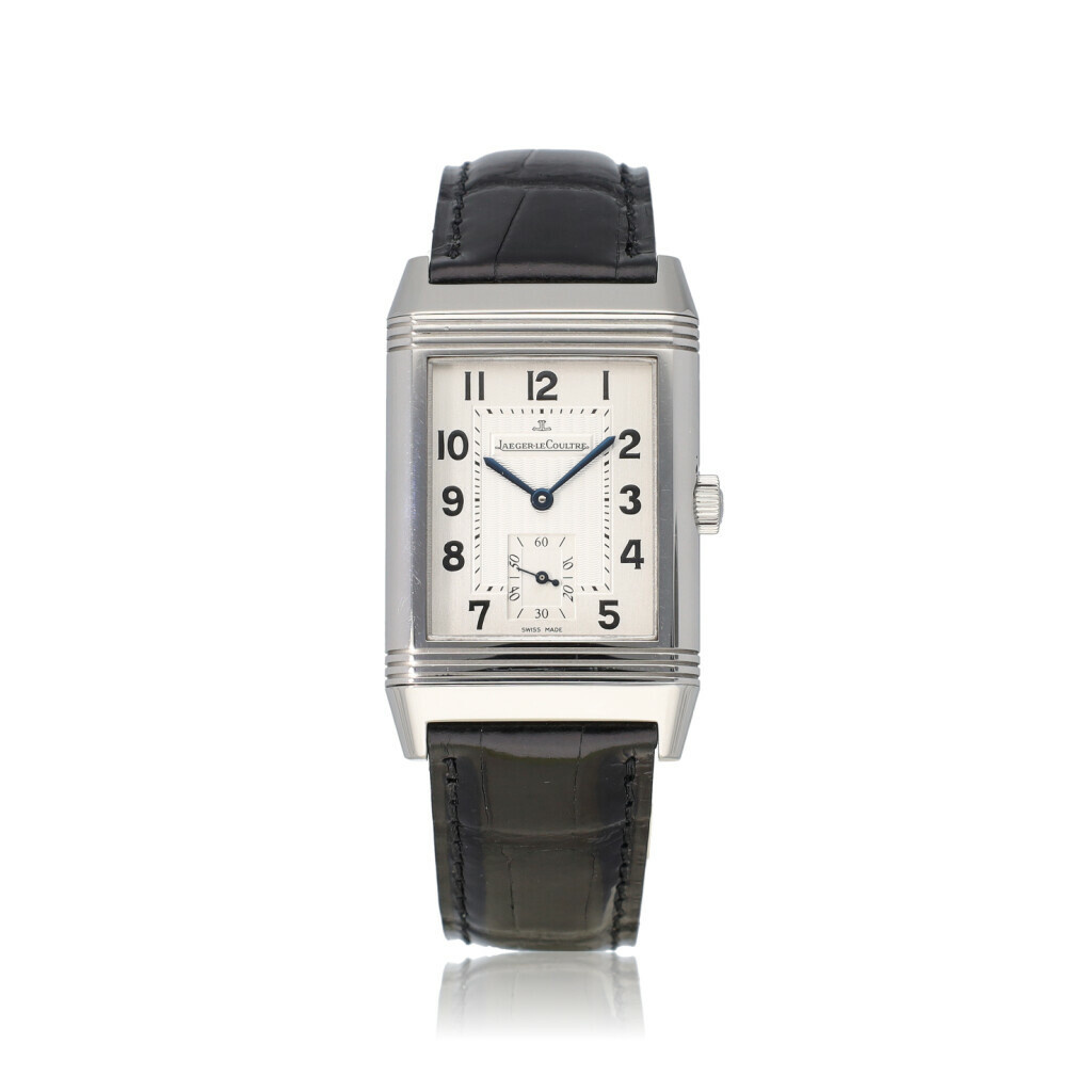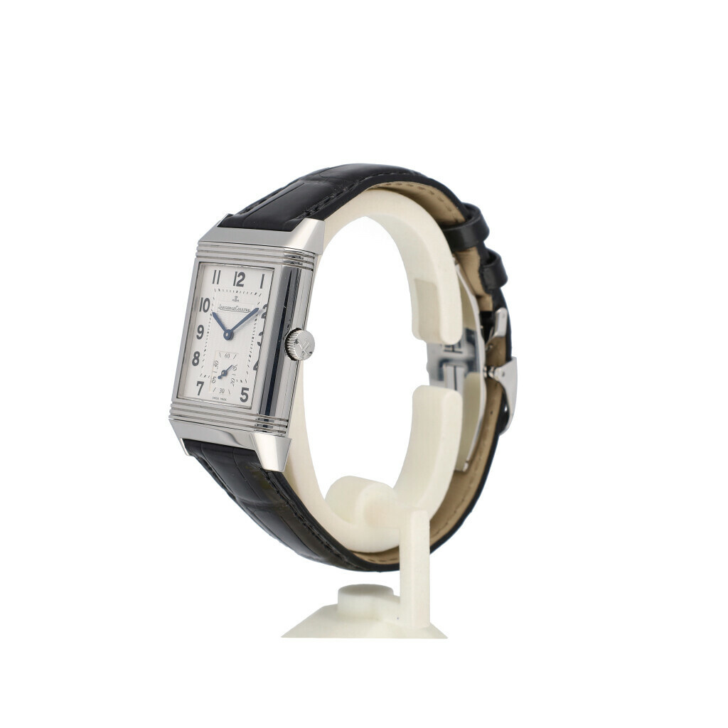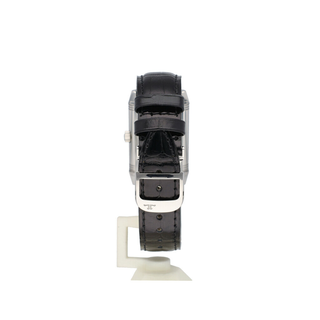 In very good condition Jaeger-LeCoultre Reverso Grand Taille in steel with silver dial and brand new black JLC strap without box and/or papers.