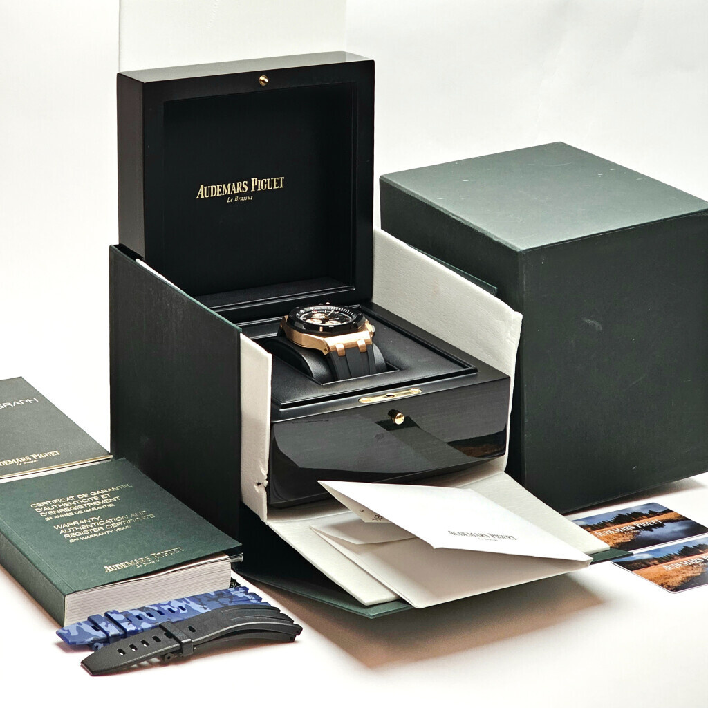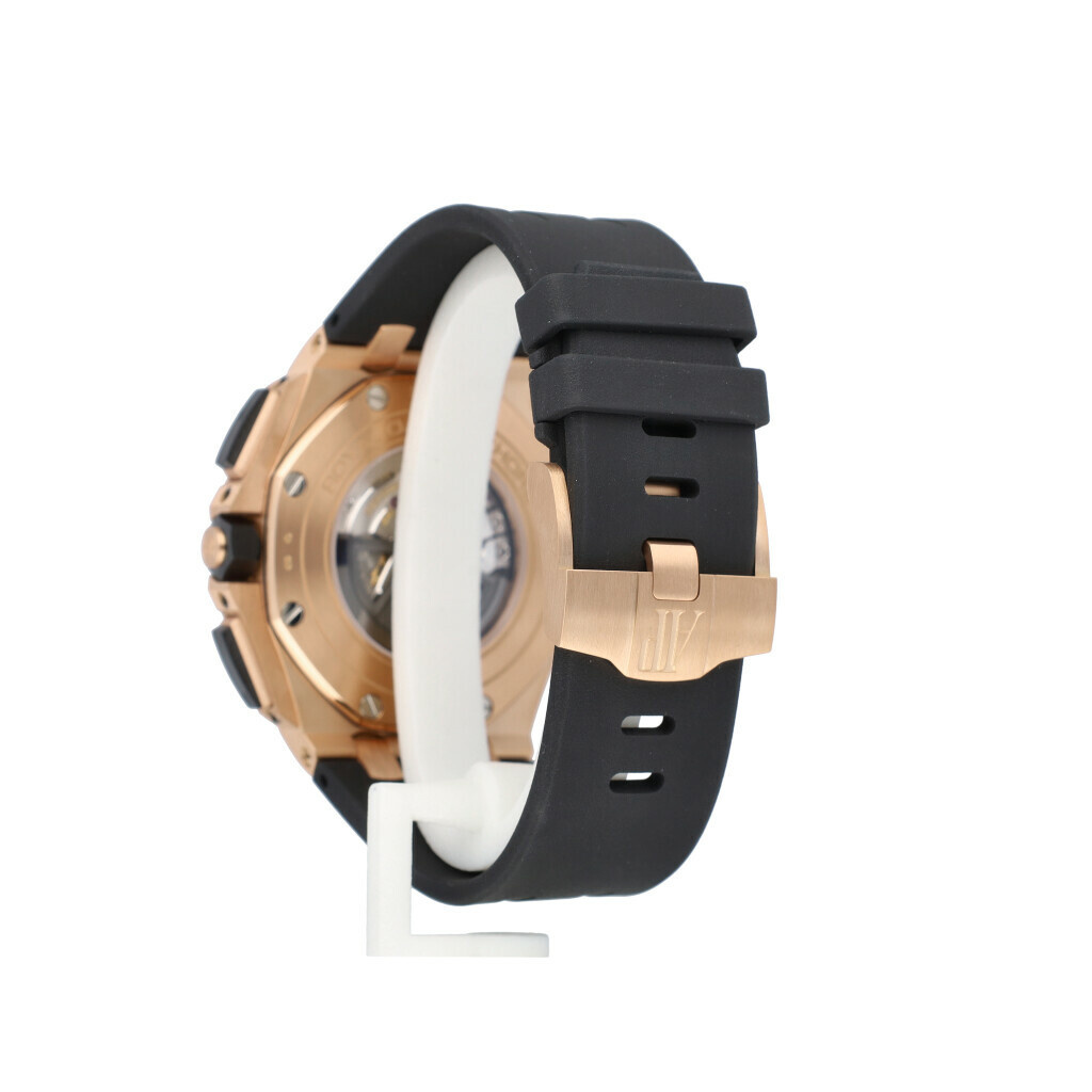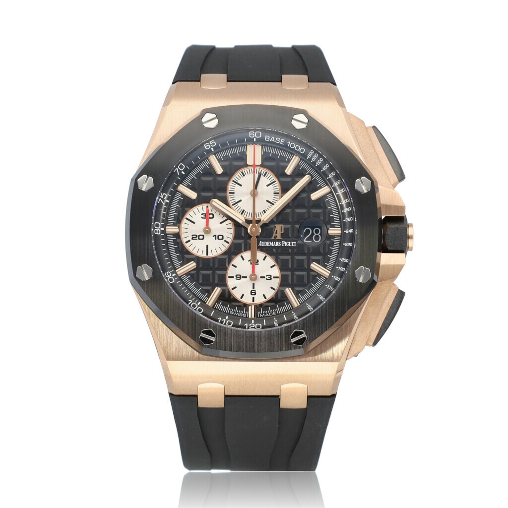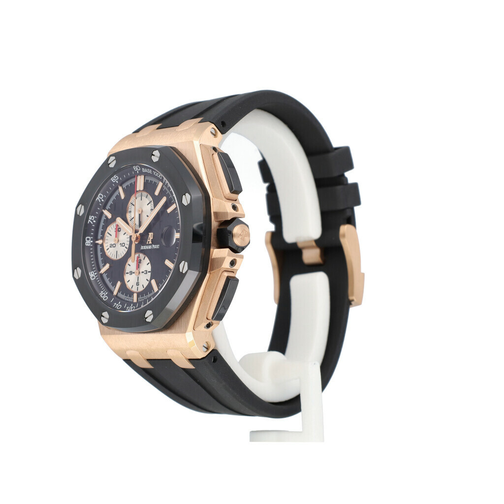 In very good condition Audemars Piguet Royal Oak 44mm Offshore Chronograph in rose gold and ceramic from 2014 complete with box and papers. AP serviced 12-2024 for € 2.500,- and not worn since. AP service papers included.