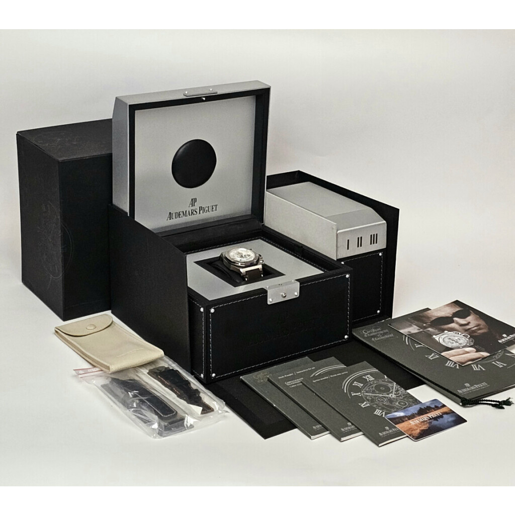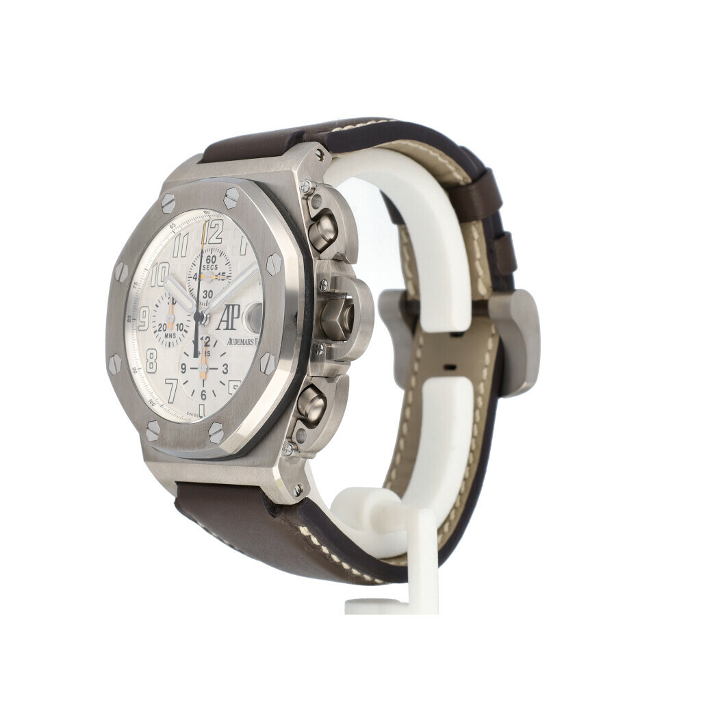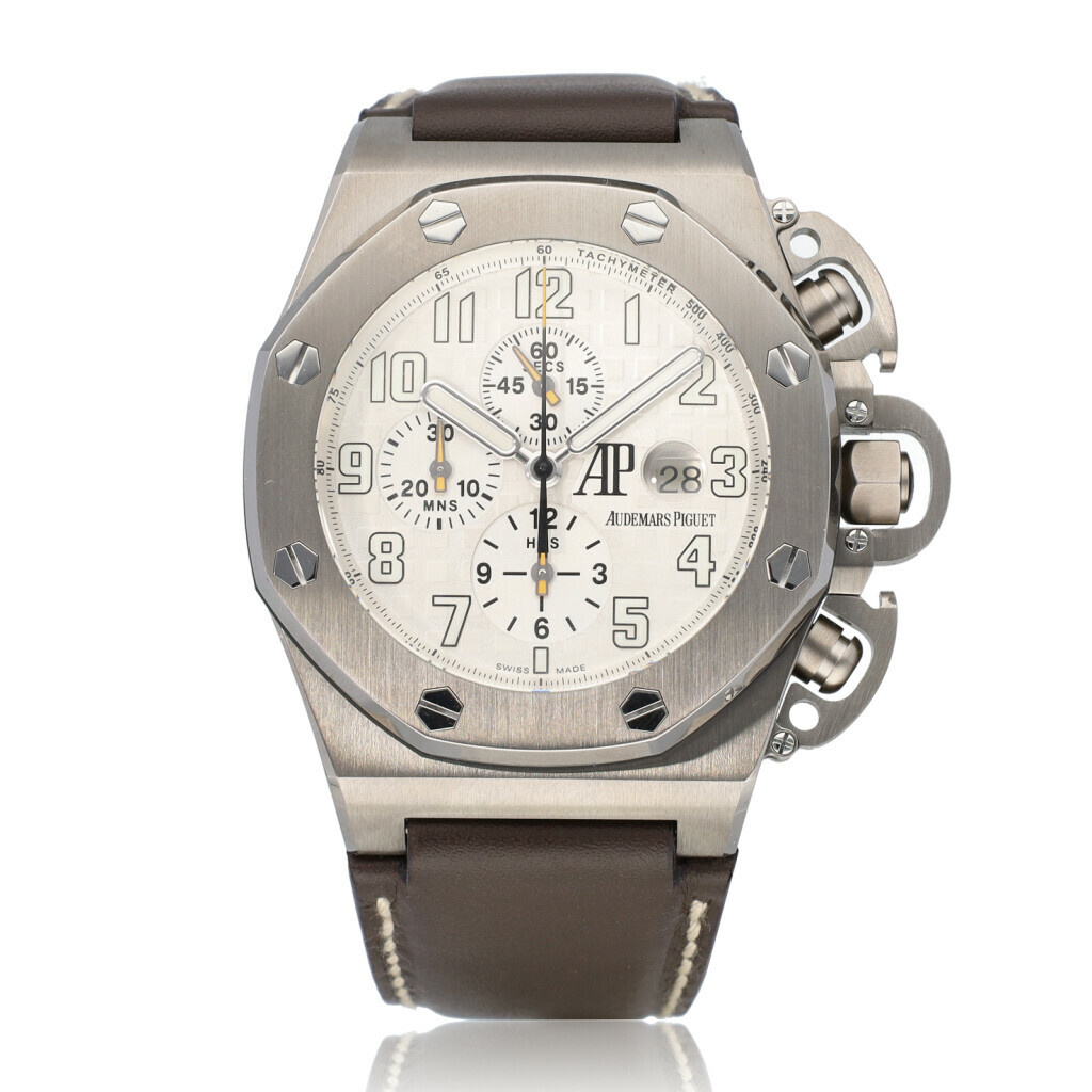 In very good condition, very complete collectors set Audemars Piguet Royal Oak Offshore T3 so called Terminator / Schwarzenegger in titanium with white dial from 2044 complete with box, extract and papers. 2 extra AP straps and AP serviced 10-2024 an not worn since. AP service certificate included.