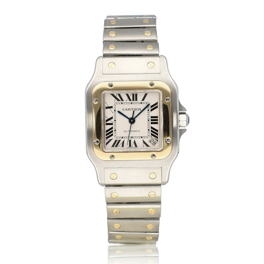 In good condition Cartier Santos Galbée in steel and yellow gold with silver dial, yellow gold bezel and steel and yellow gold bracelet from 2008 complete with box and papers.