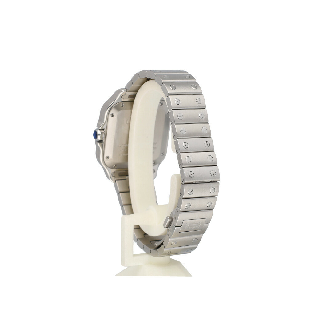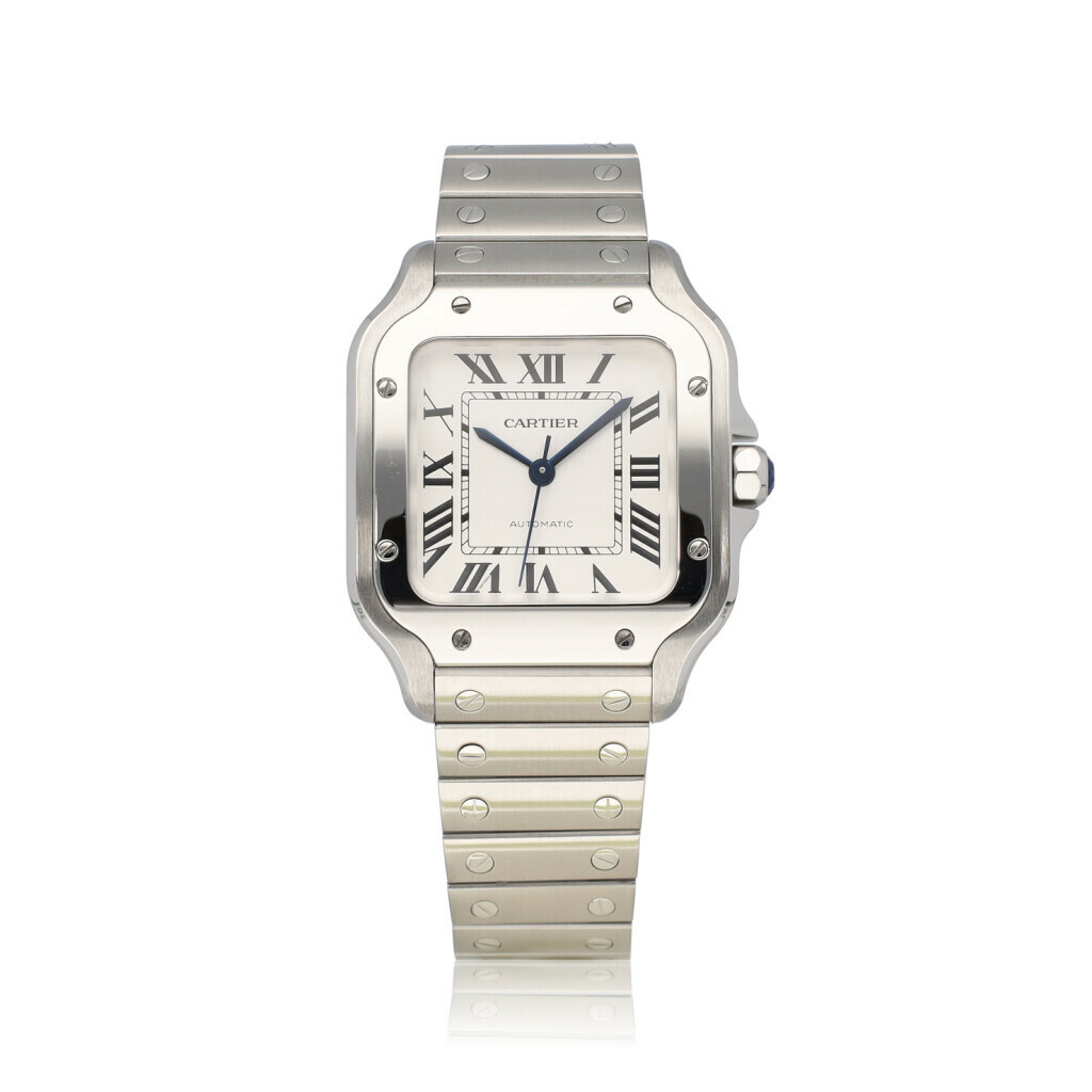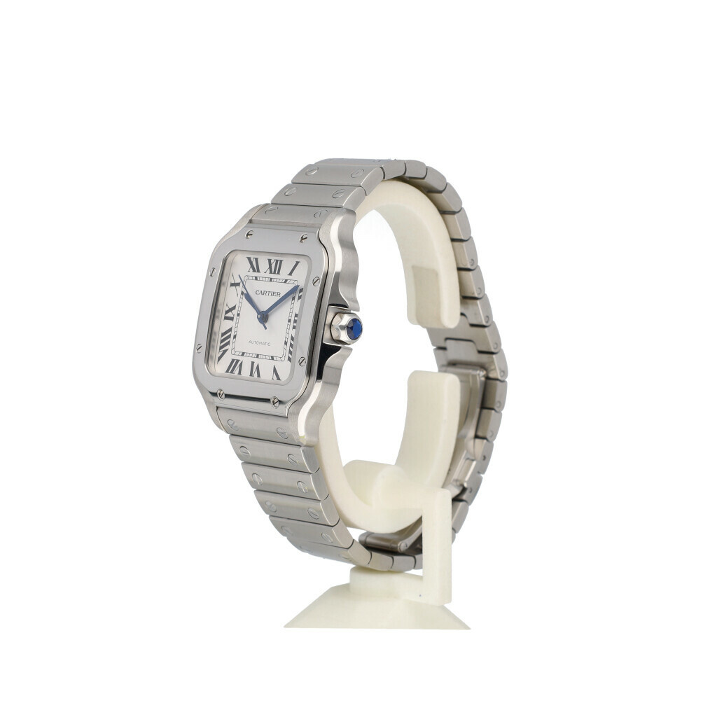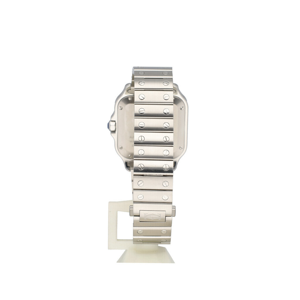 In very good condition Cartier Santos de Cartier MM 35 mm in steel with steel and extra leather bracelet with Cartier clasp from 2025 complete with box and papers.