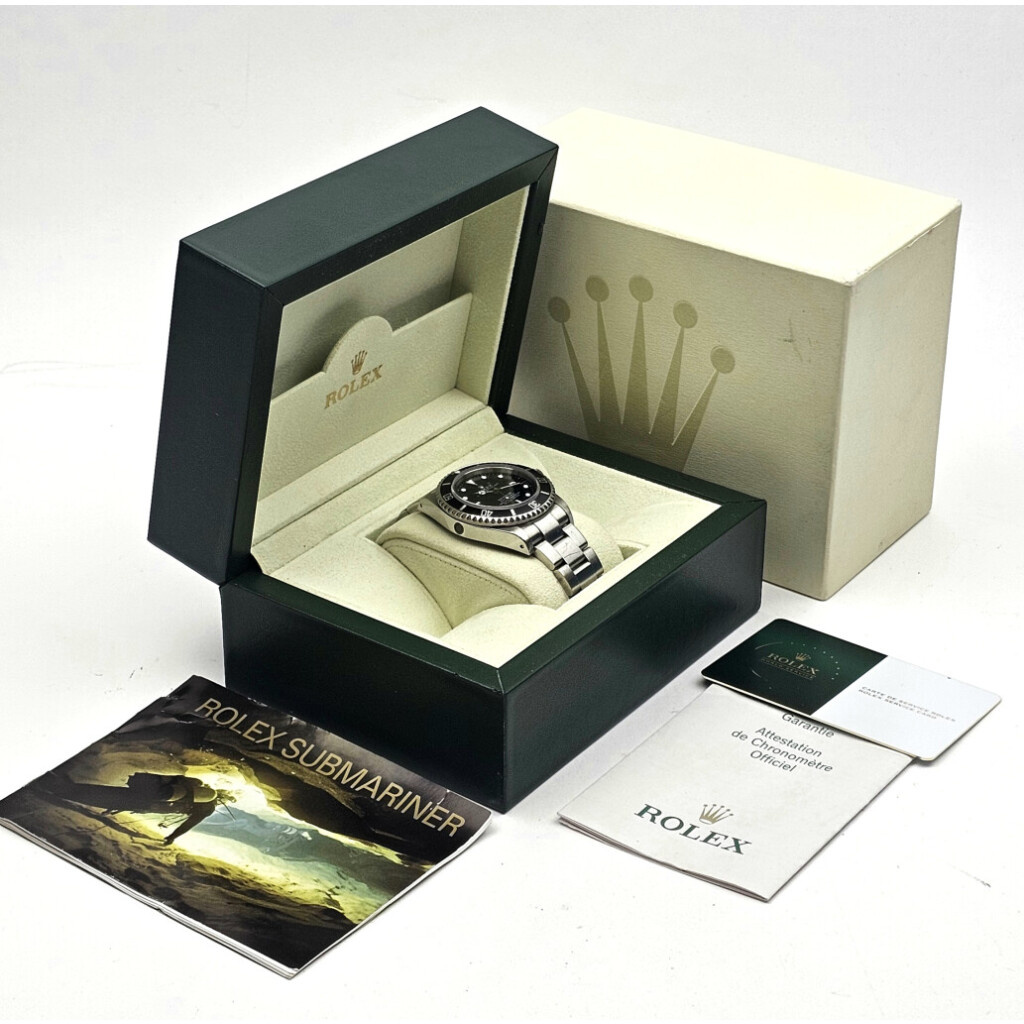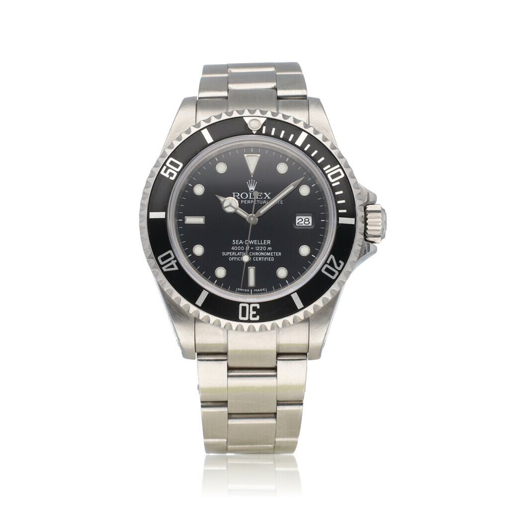 In very good condition Rolex Sea-Dweller 4000 in steel with black dial, black bezel and steel Oyster bracelet from 2003 (Y510... serial) complete with box and papers. Rolex serviced 11-2025 and not worn since. Not polished during service. Rolex service certificate included.