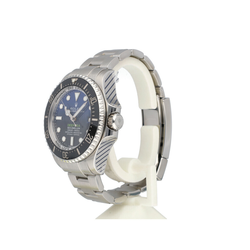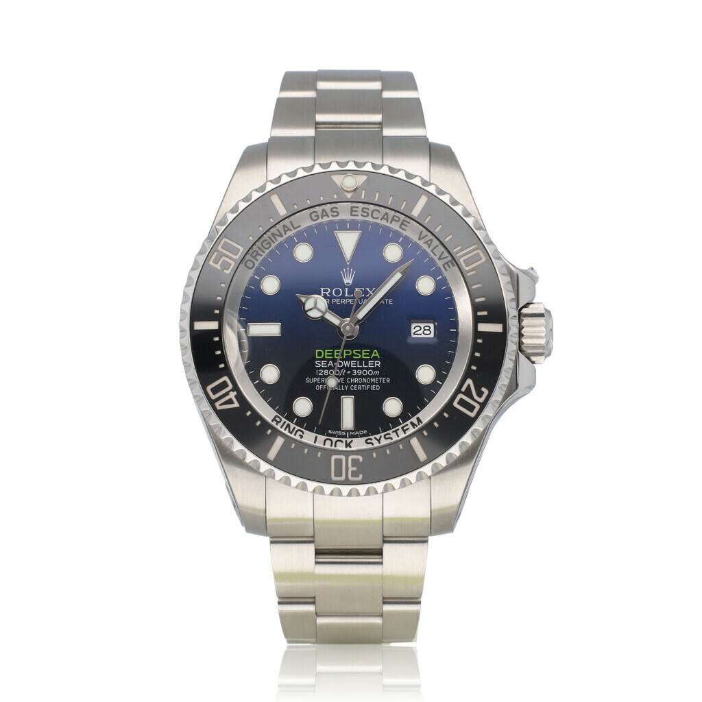 In very good condition Rolex Sea-Dweller Deepsea in steel with black and blue dial, black ceramic bezel and steel Oyster bracelet from 2017 complete with box and papers. Rolex serviced 10-2025 and not worn since. Rolex service certificate included.