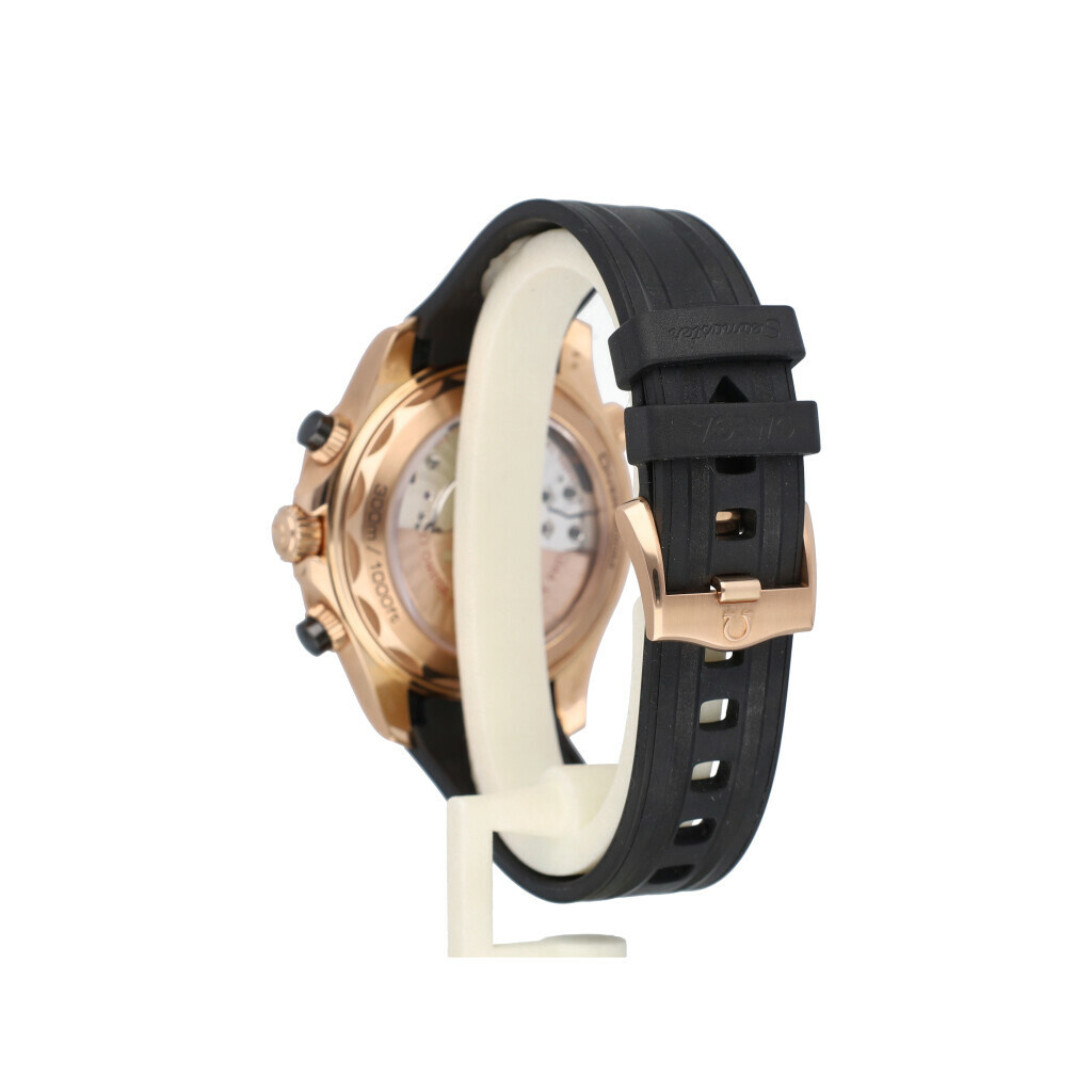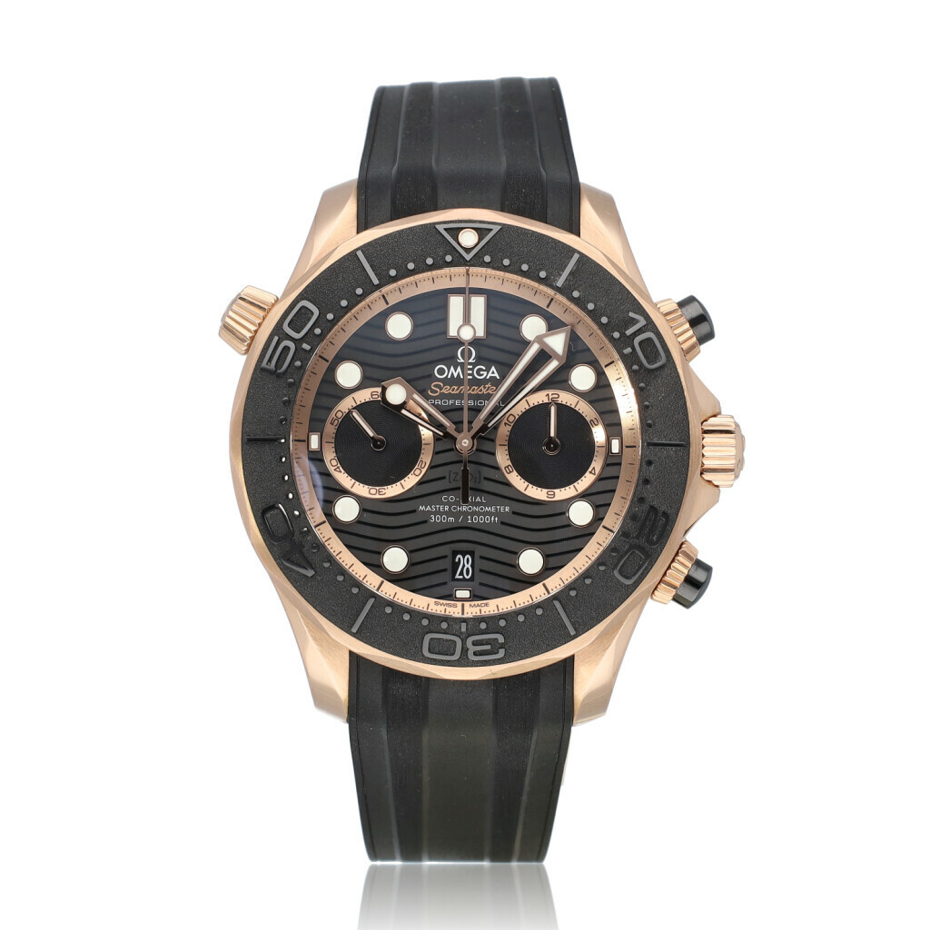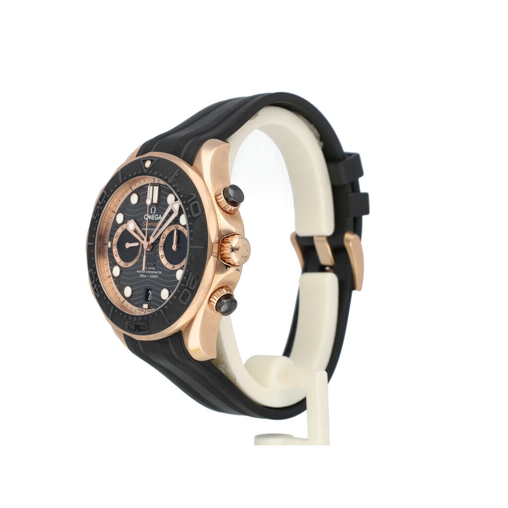 In very good condition Omega Seamaster Diver 300M in rose gold with black dial and rubber strap from 2021 complete with box and papers.
