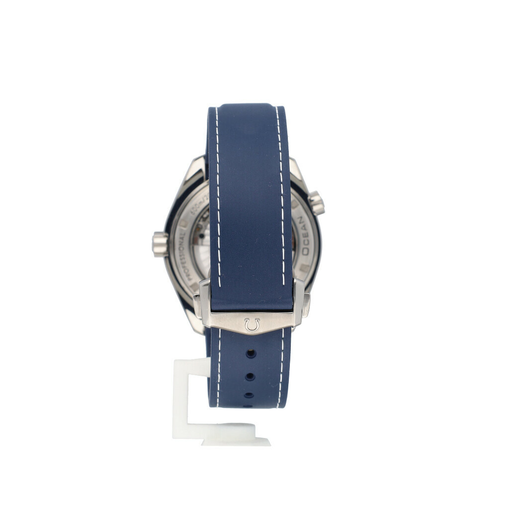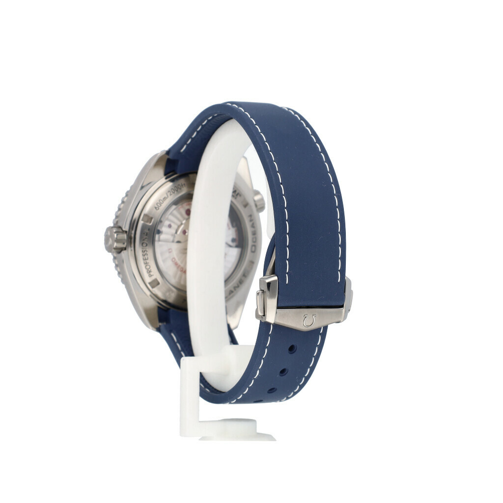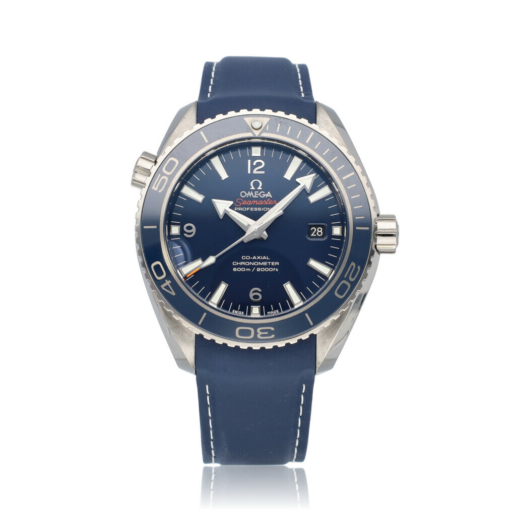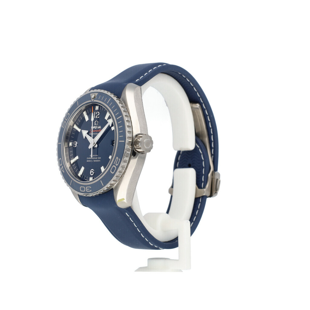 In very good condition Omega Seamaster Planet Ocean Diver 300M Co-Axial Master Chronometer in titanium with blue dial and rubber strap from 2013 complete with box and papers.