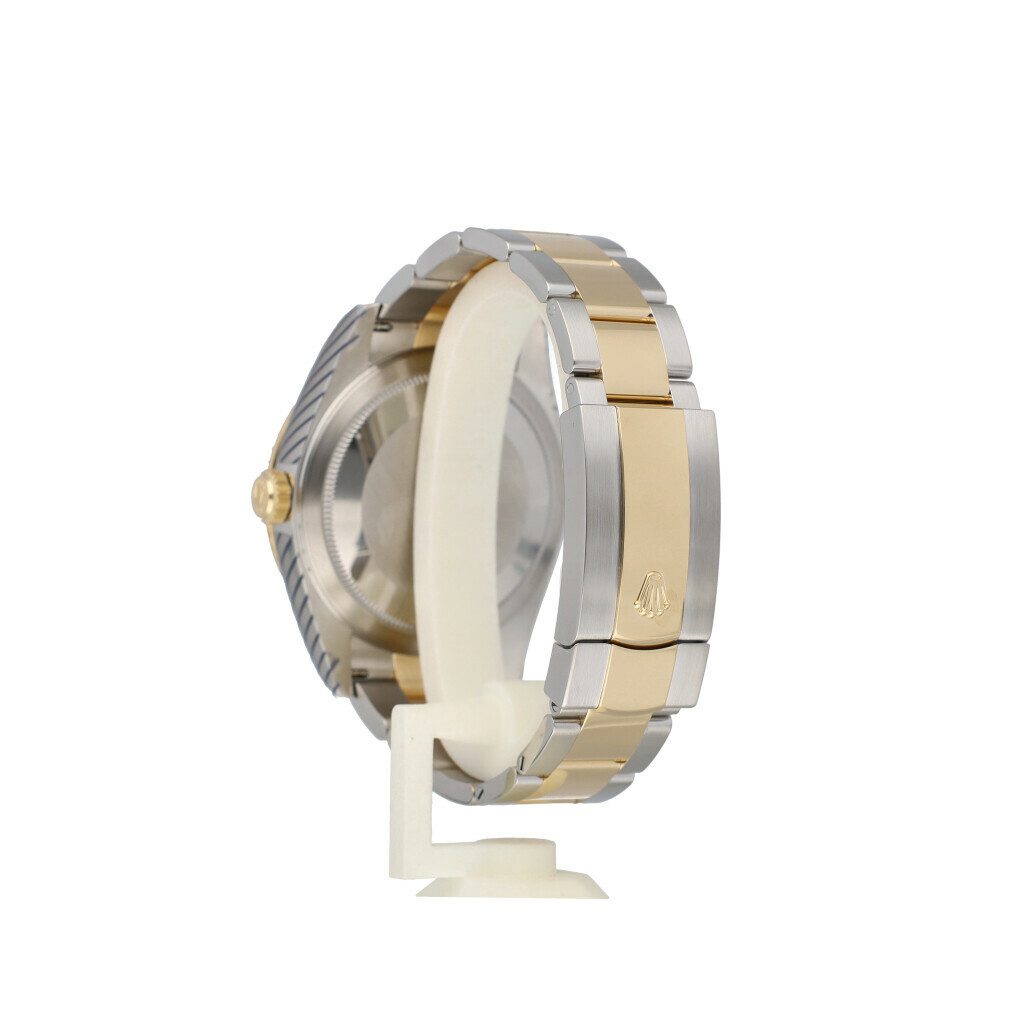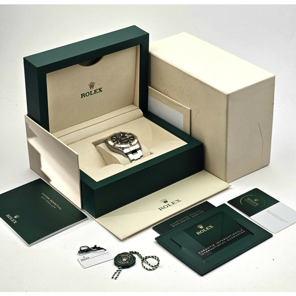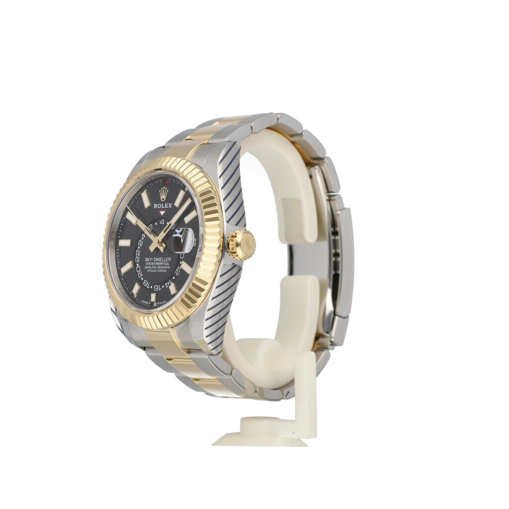 In very good condition Rolex Sky-Dweller in steel and yellow gold with black dial and Oyster bracelet from 2023 complete with box and papers. Rolex serviced 12-2025 and not worn since. Rolex service certificate included.