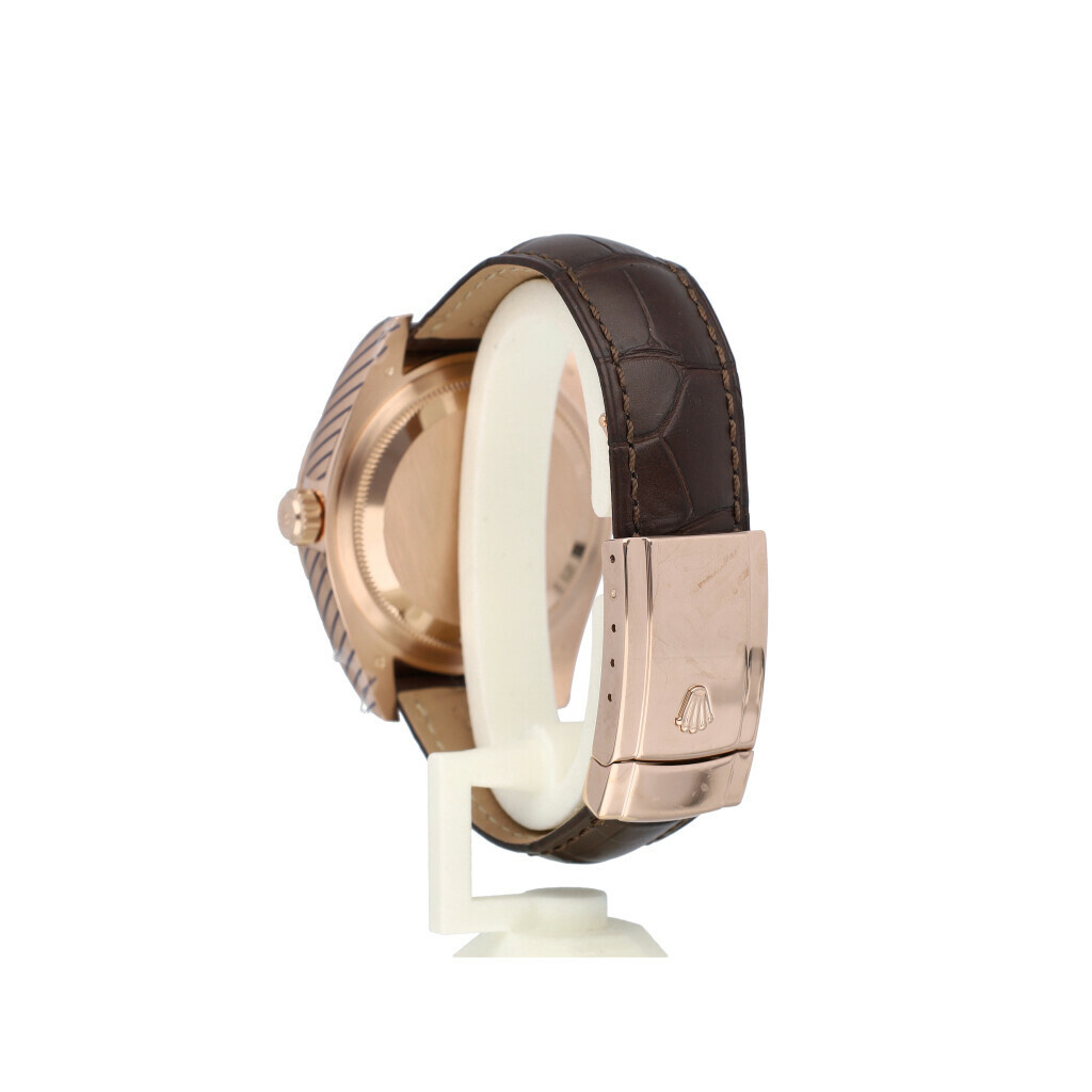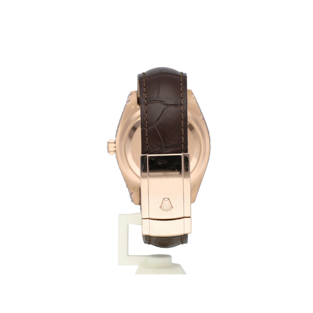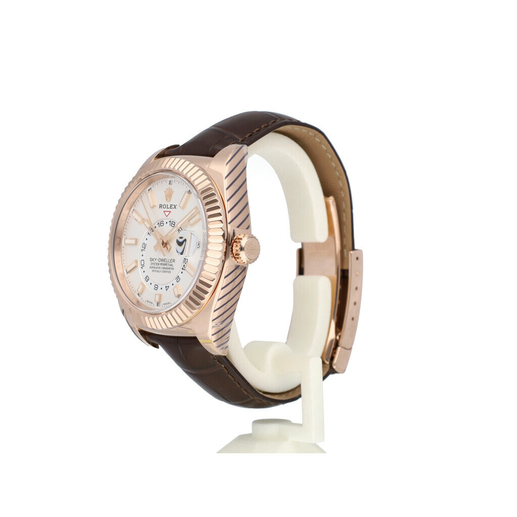 In very good condition Rolex Sky-Dweller in rose gold with white index dial, rose gold fluted bezel and brand new brown leather Rolex strap from 2019 complete with box and papers. Rolex serviced 11-2025 including new brown leather Rolex strap, not worn since. Rolex service certificate included.
