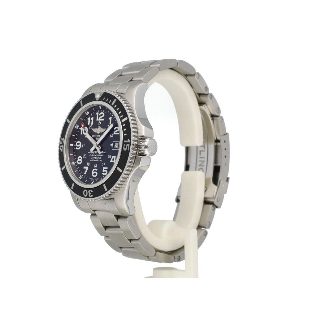 In very good condition Breitling Superocean II 44mm in steel with black dial from 2017 complete with box and papers. Breitling serviced 1-2026 and not worn since. Breitling service certificate included.