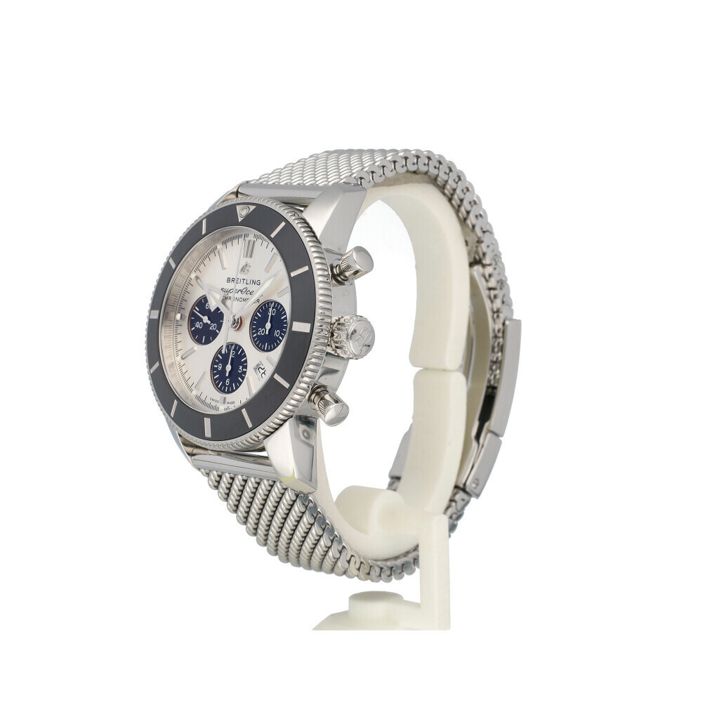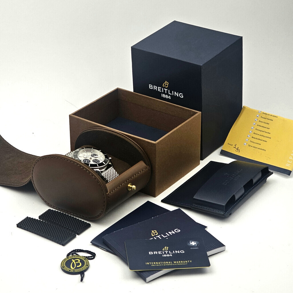 In very good condition, Breitling Superocean Heritage B01 Chronograph in steel with black dial, black ceramic bezel and steel Breitling bracelet from 2020 complete with box and papers. Breitlig serviced 11-2023 and hardly worn since. Breitling service certificate included.