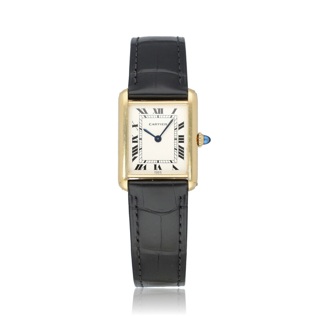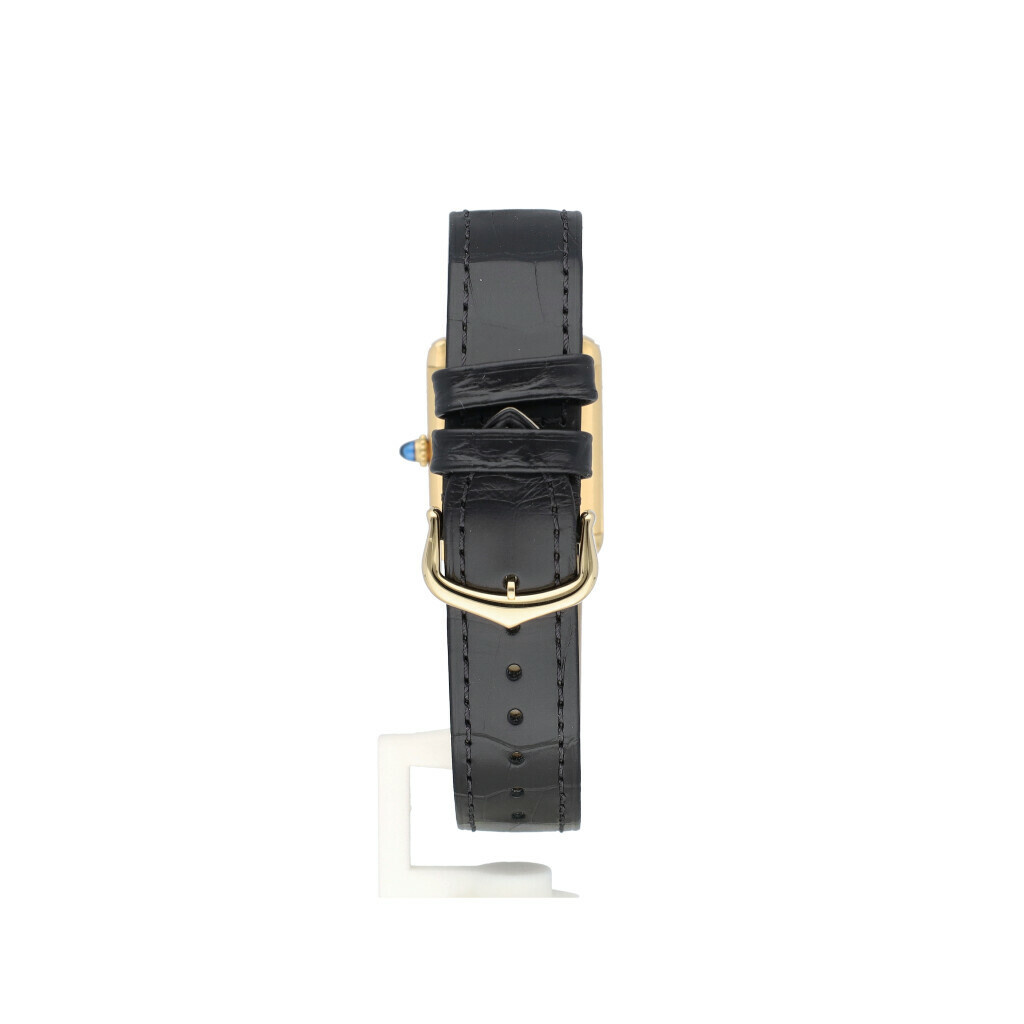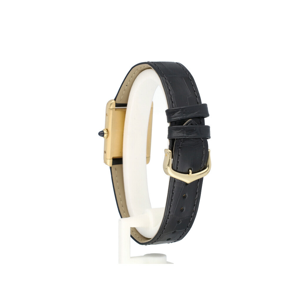 In very good condition Cartier Tank Louis in yellow gold with white enamel Paris dial on a black, brand new Cartier alligator strap. No box and/or papers.