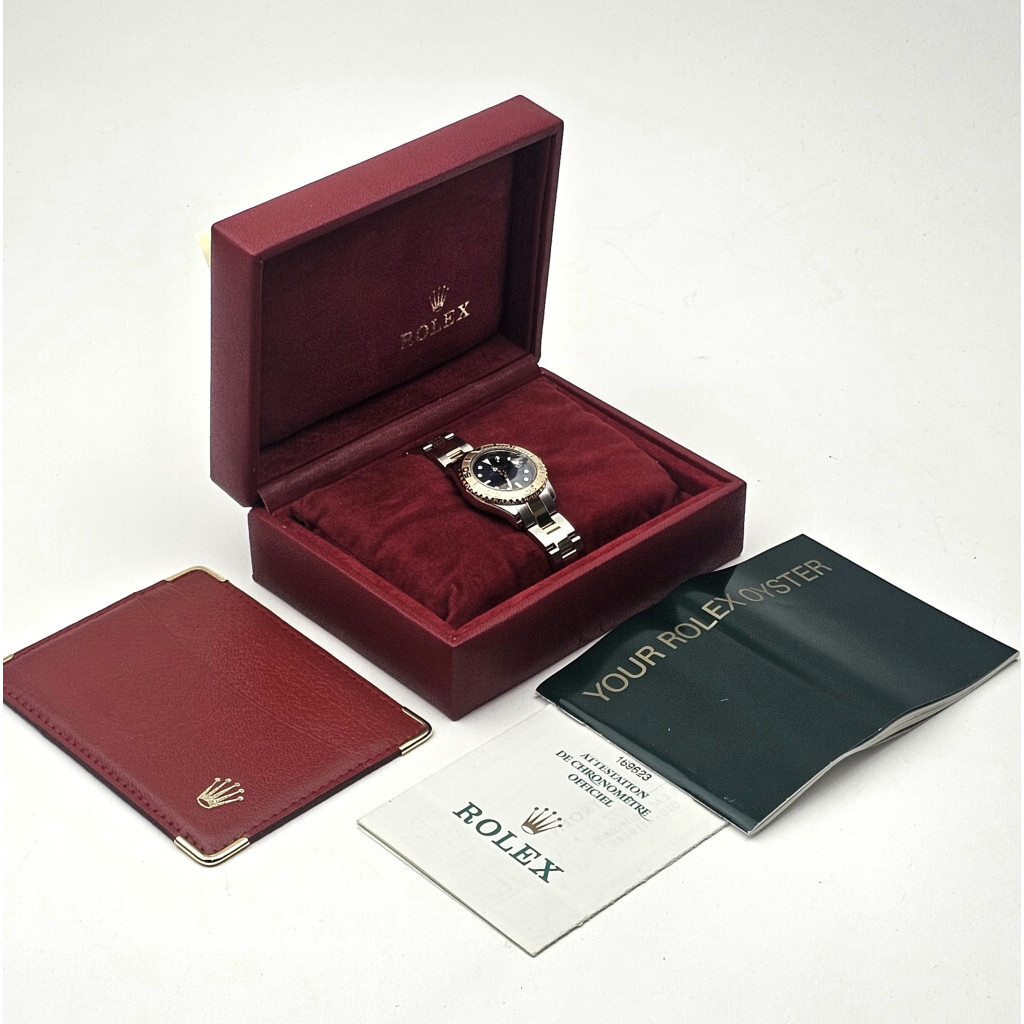 In very good condition Rolex Yacht-Master 29mm in steel and yellow gold with yellow gold bezel, blue dial and steel and yellow gold Oyster bracelet from 2002 complete with box and papers.