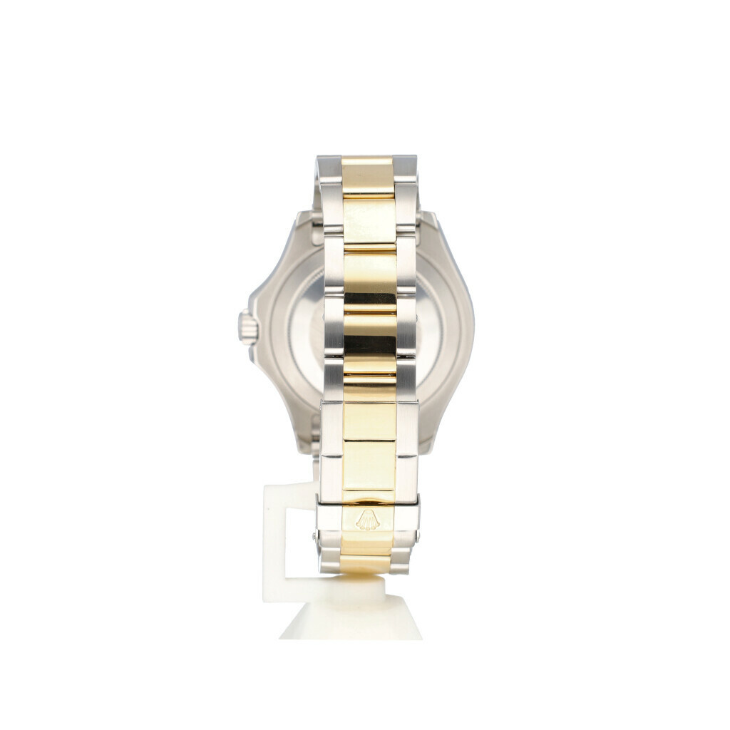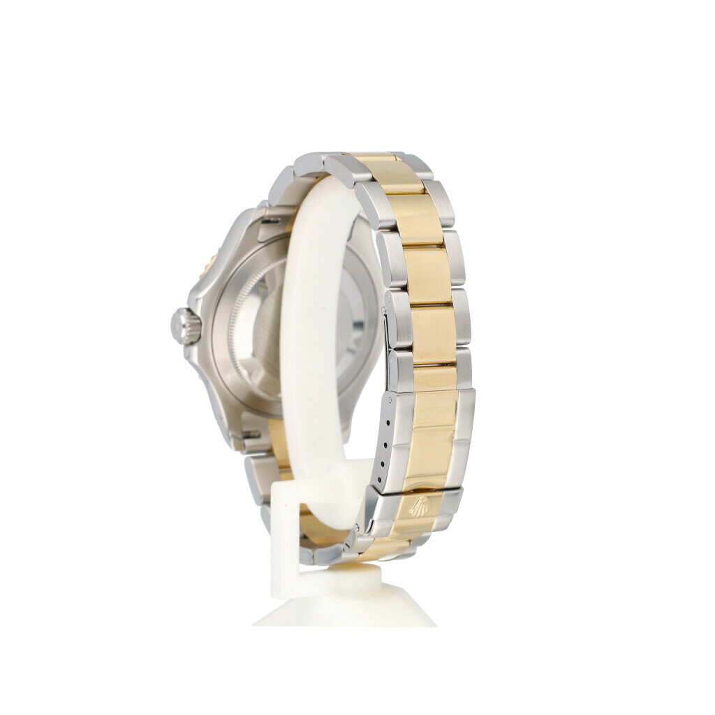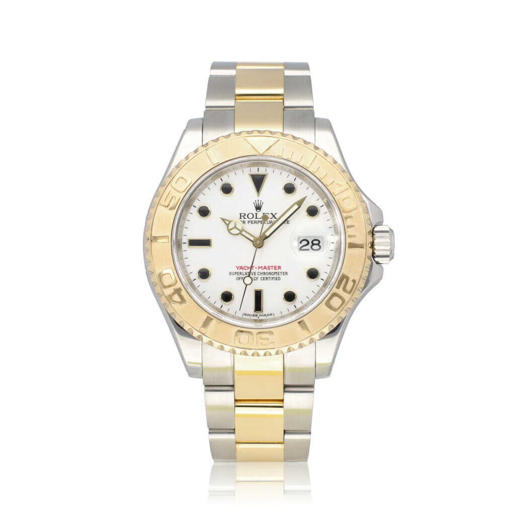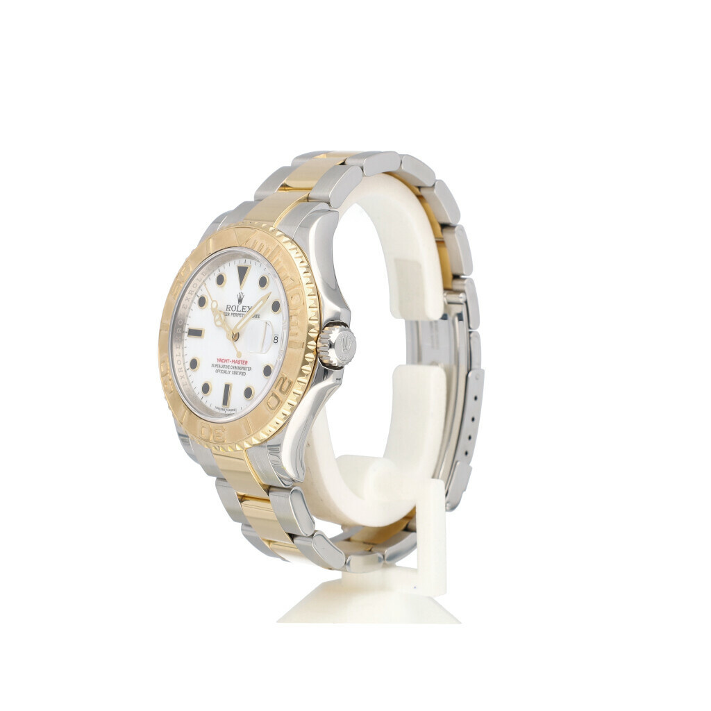 In very good condition Rolex Yacht-master in steel and yellow gold with white dial and steela ad yellow gold Oyster bracelet from 2008 complete with papers, no box.