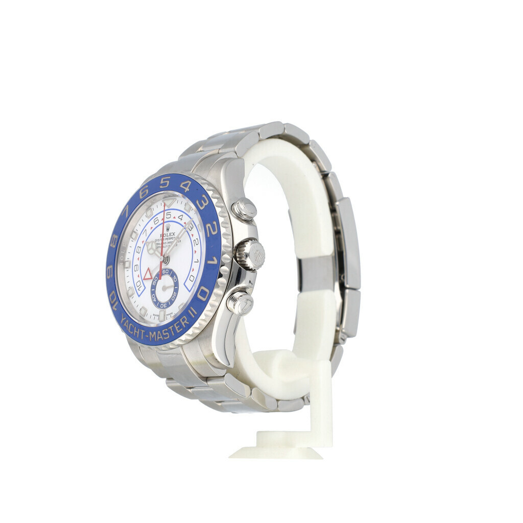 In very good condition Rolex Yacht-Master II in steel with white dial, blue blue ceramic bezel and steel Oyster bracelet from 2020 complete with box and papers.