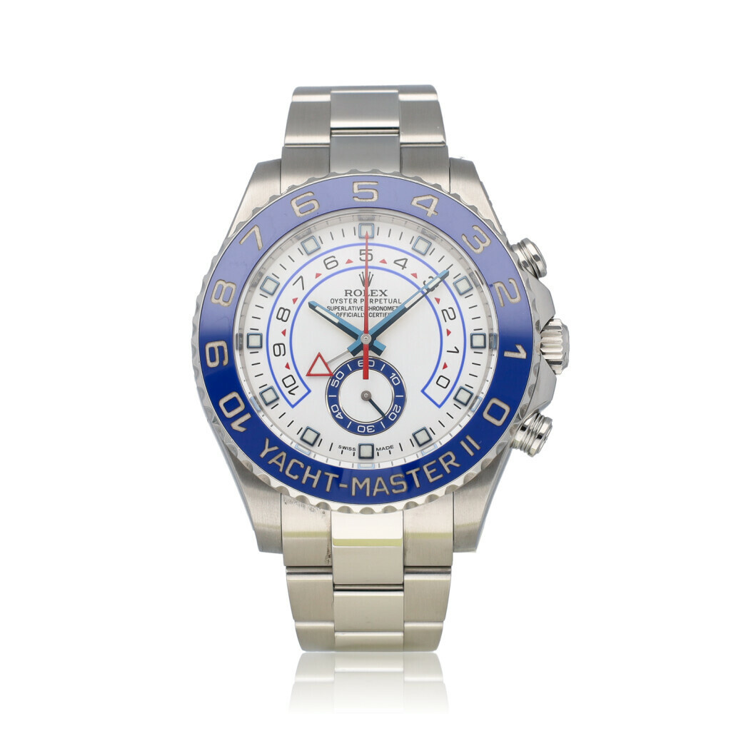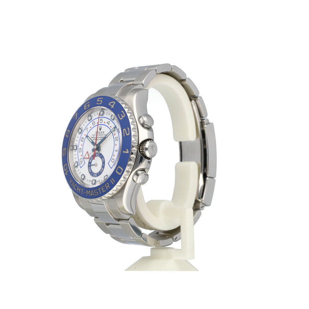 In very good condition Rolex Yacht-Master II in steel with white dial, black ceramic bezel and steel Oyster bracelet from 2017 complete with box and papers.