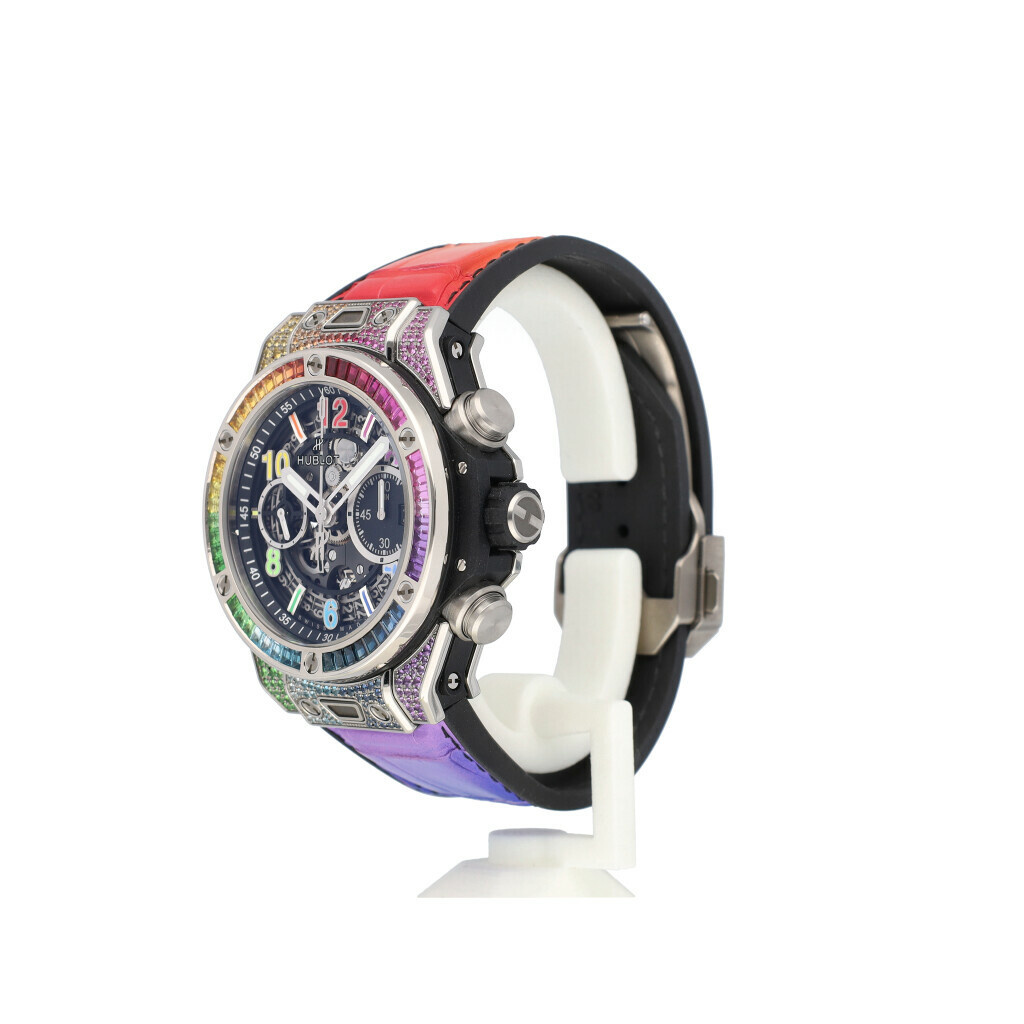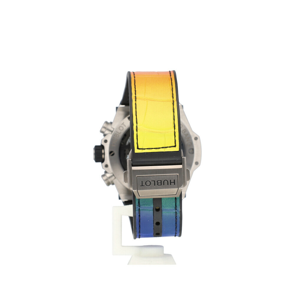 In very good condition Hublot Big Bang Unico rainbow in titanium with see through 'skeleton' dial, factory diamond rainbow setting and leather / rubber Hublot strap from 2025 complete with box and e-certificate (= Hublot certificate) 21% VAT deductible when shipped outside of the European Union.