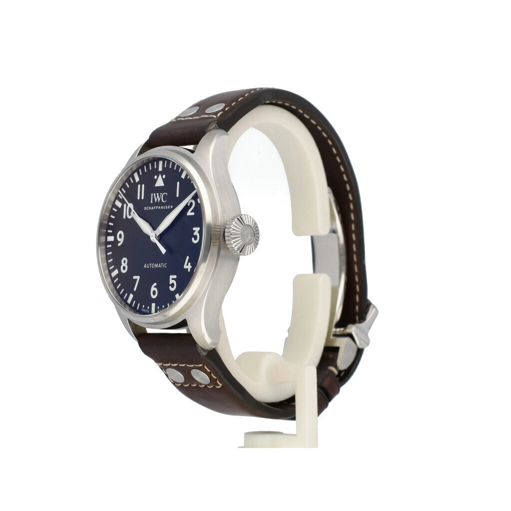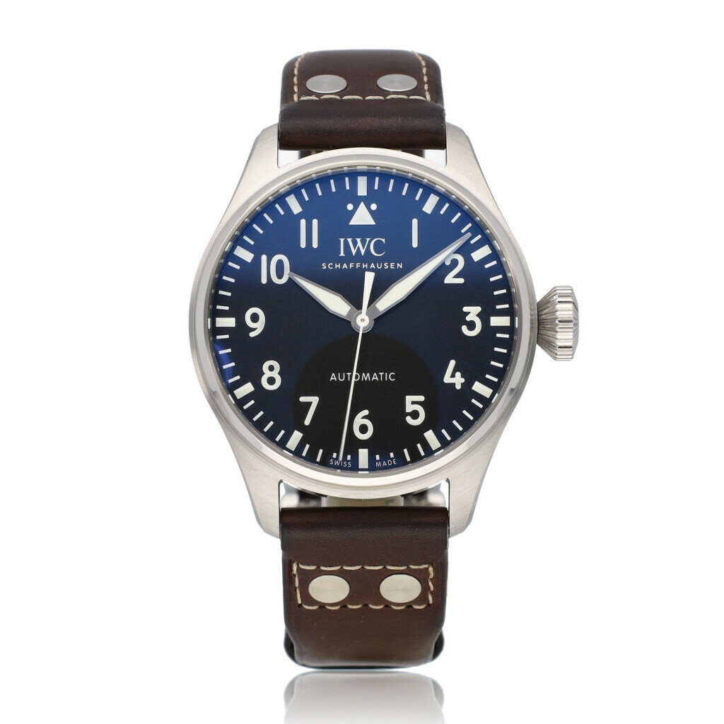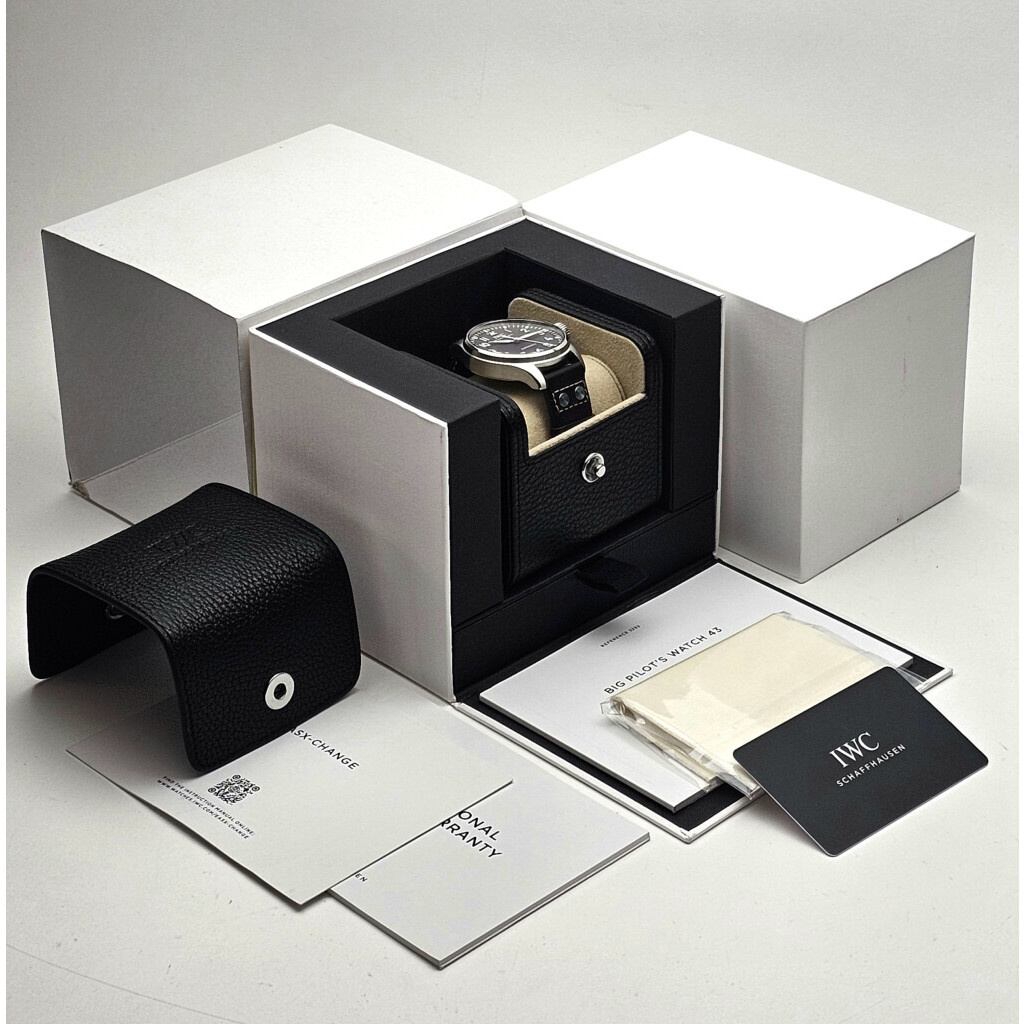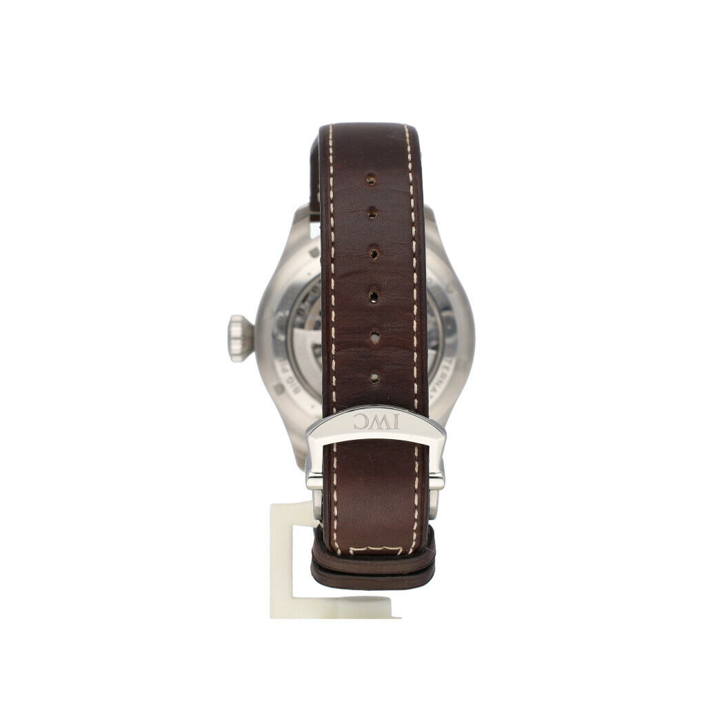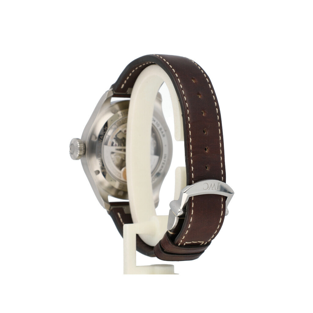 In very good condition IWC Big Pilot's Watch in steel with black dial and brown leather IWC strap from 2022 complete with box and papers.