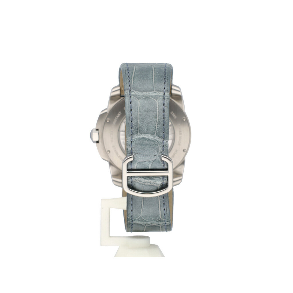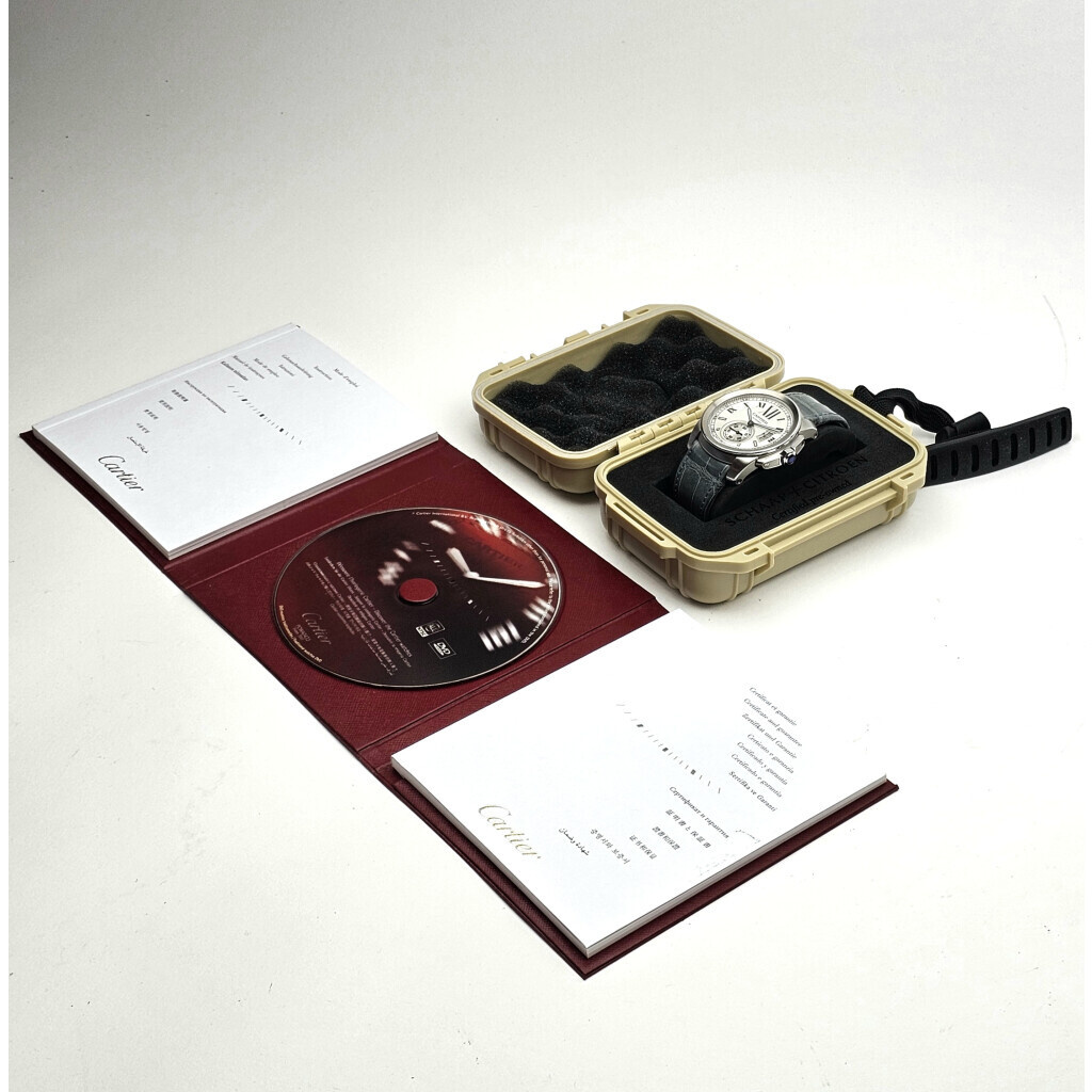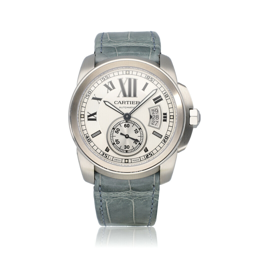 In very good condition Cartier Calibre De Cartier 42 mm in steel with silver dial and leather Cartier strap from 2012 complete with papers, no box.