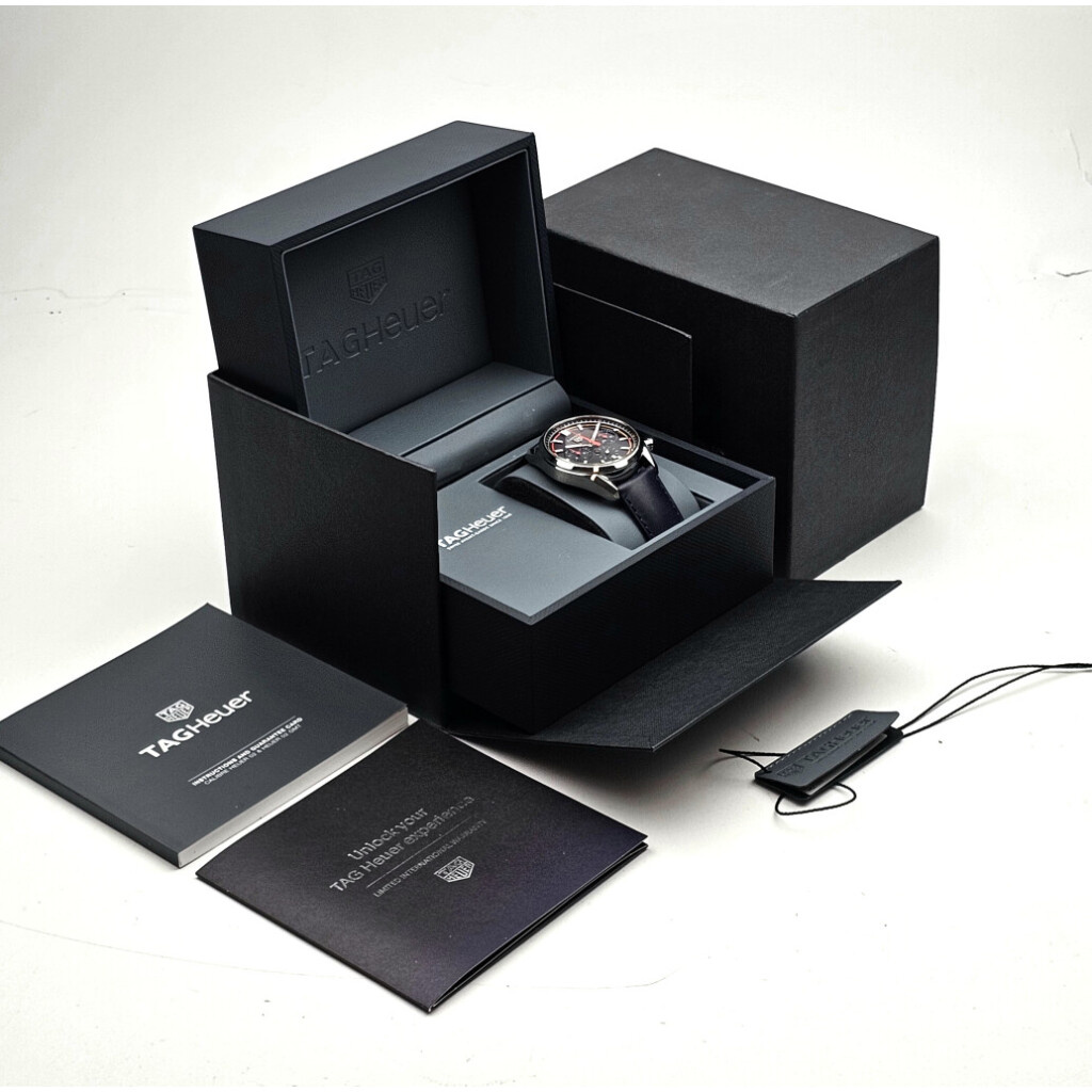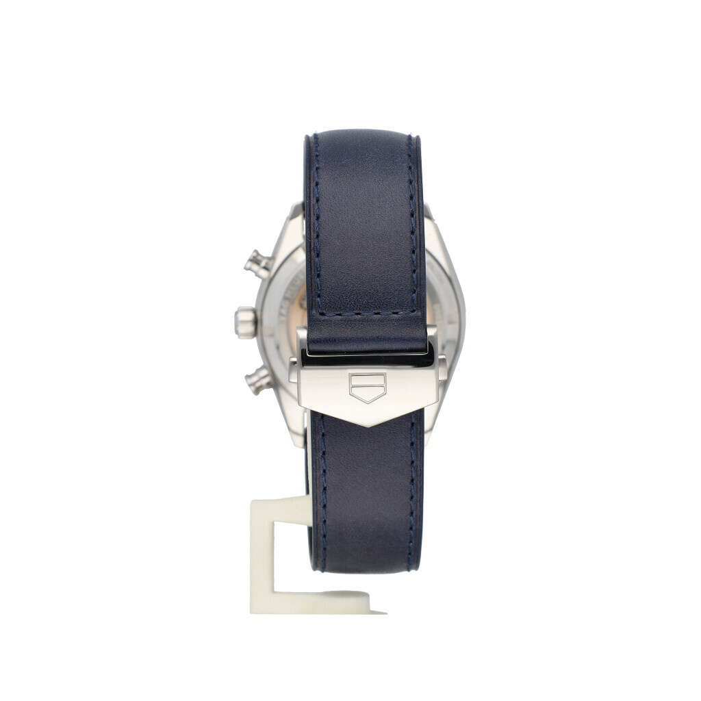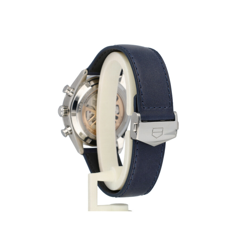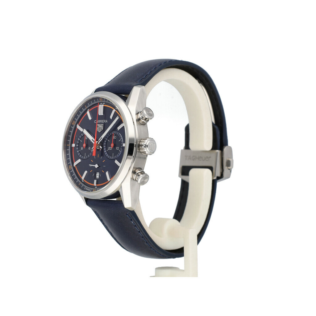 In very good condition Tag Heuer Carrera Chronograph in steel with blue dial and leather strap from 2023 complete with box and papers.