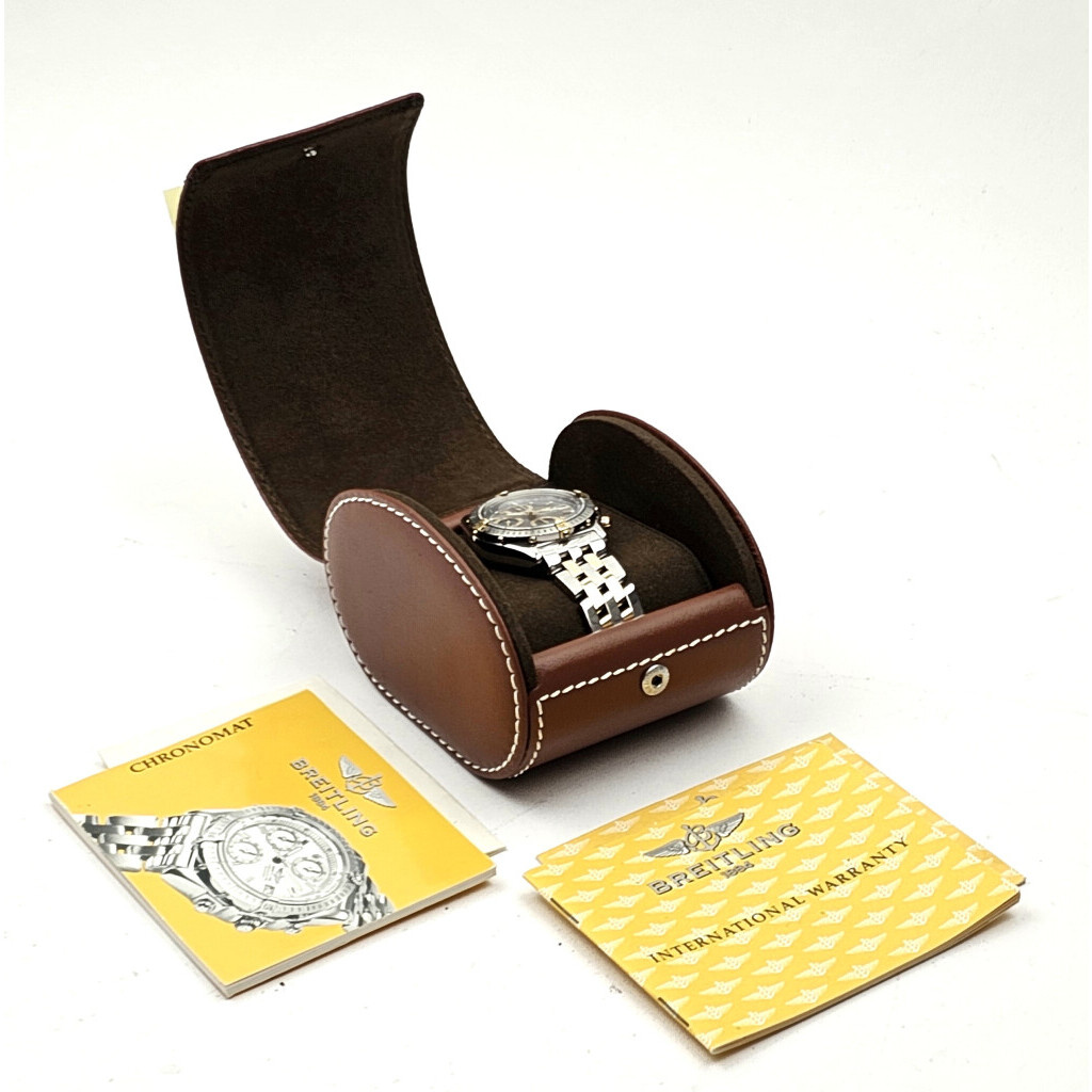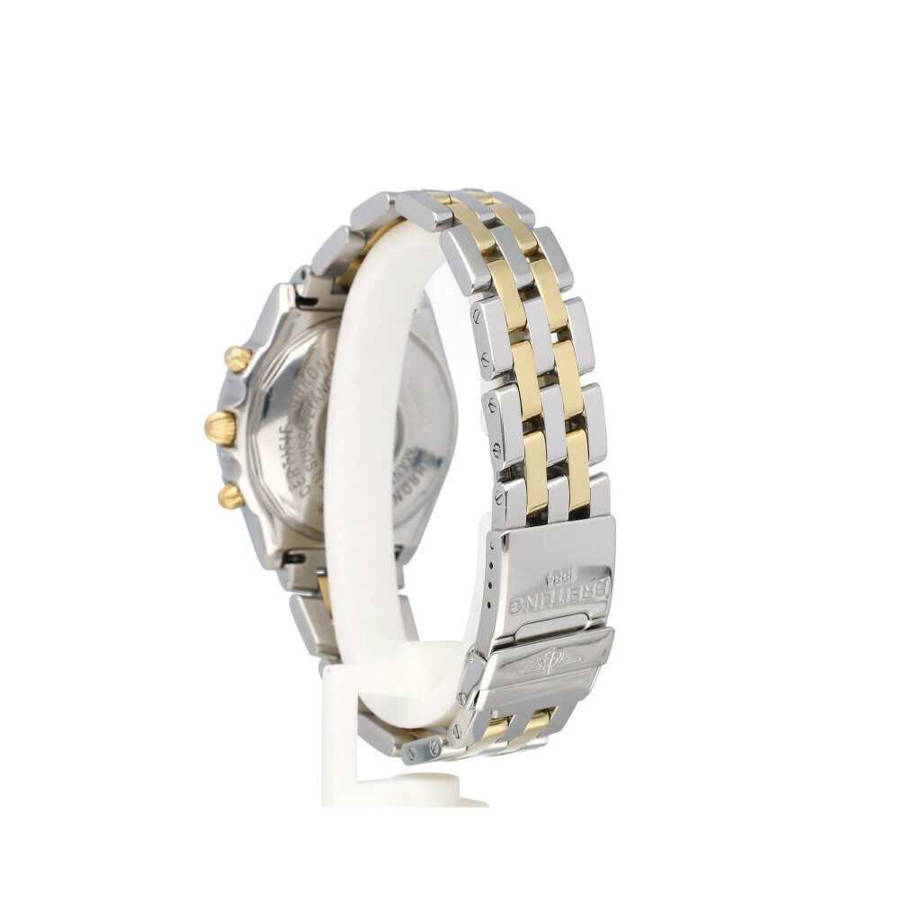 In very good condition Breitling Chronomat in yellow gold and steel with faded blue dial and steel gold bracelet from 2001 complete with box and papers.